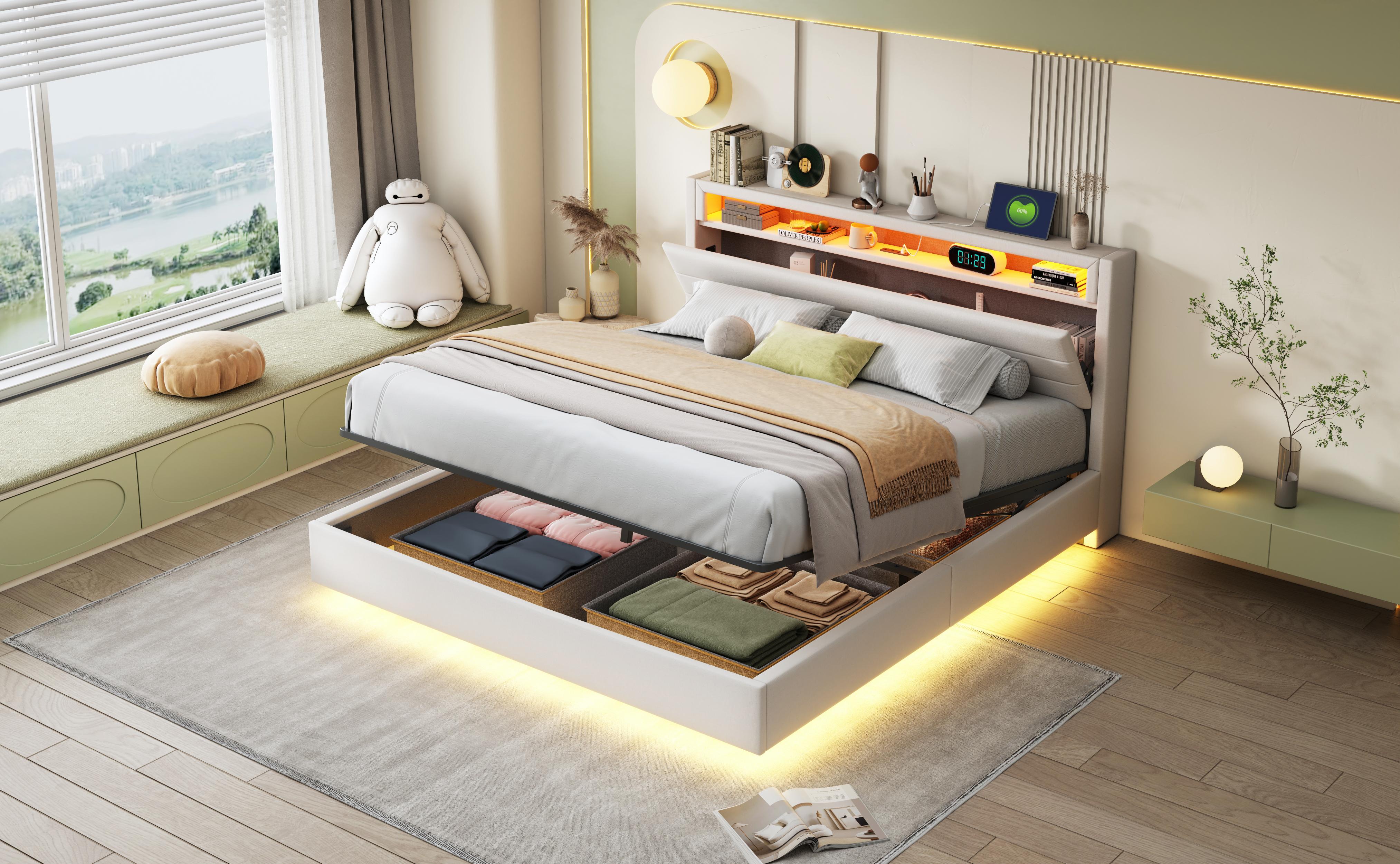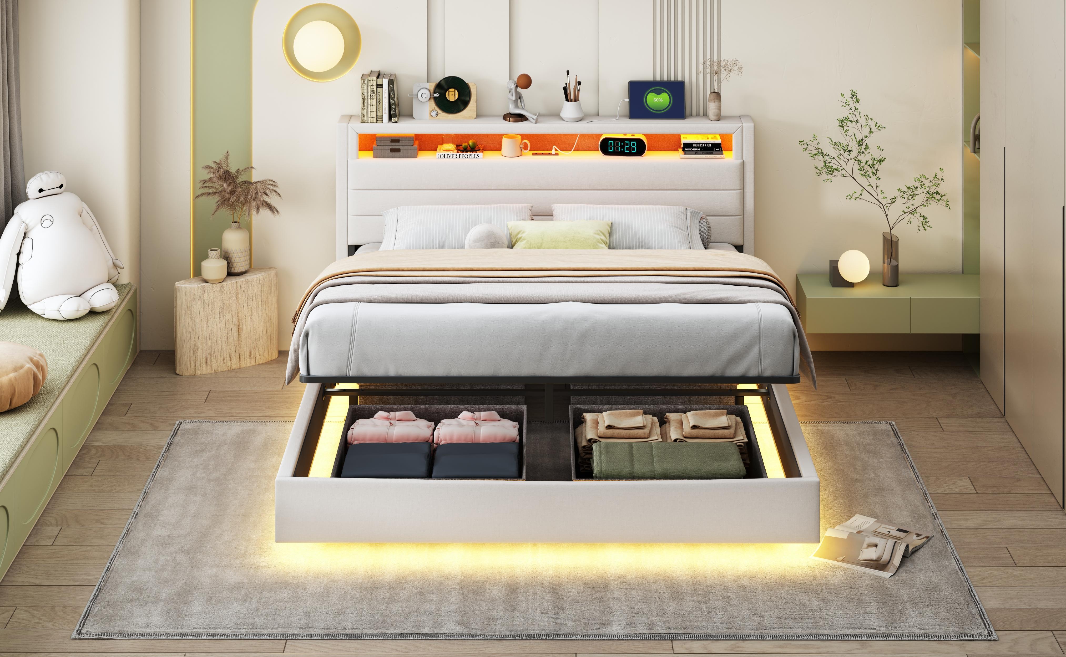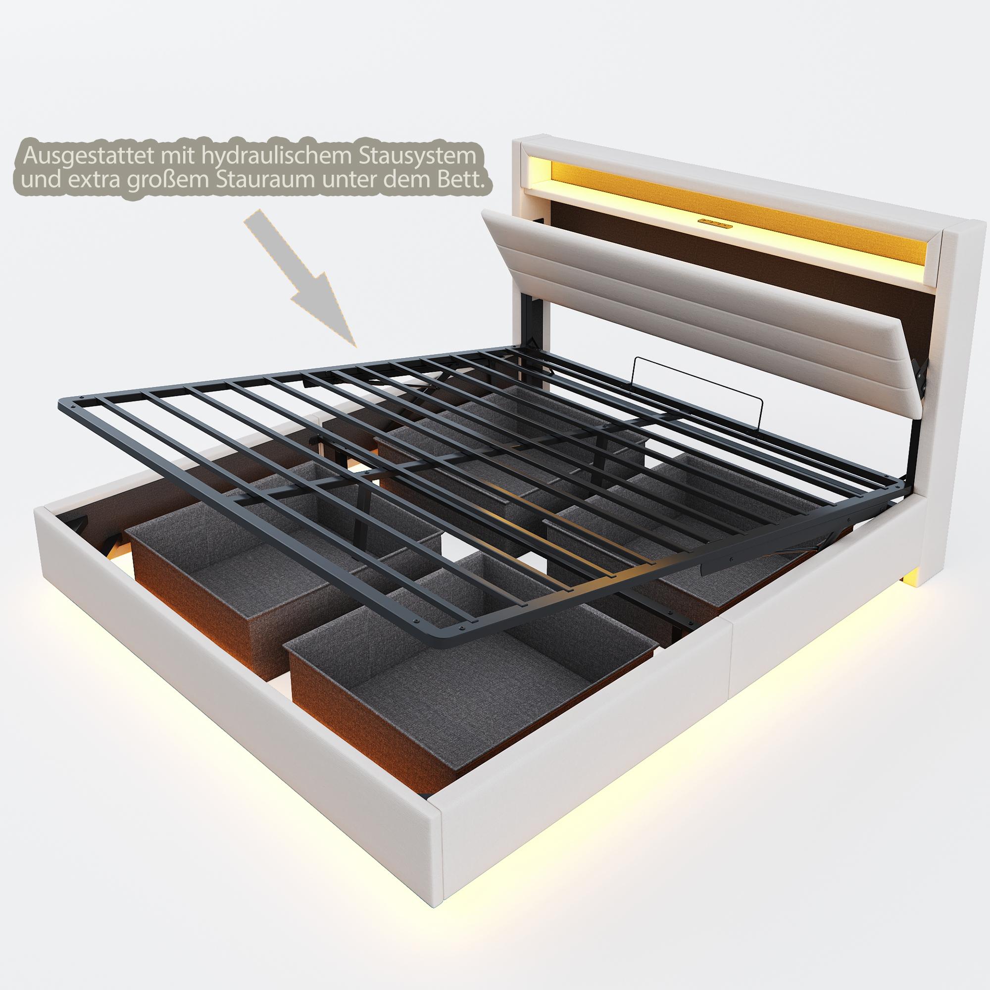 Bed met verstelbaar hoofdeinde 160x200 cm, hydraulisch zwevend frame met opbergruimte, USB en LED, beige stof (214x161x110 cm)