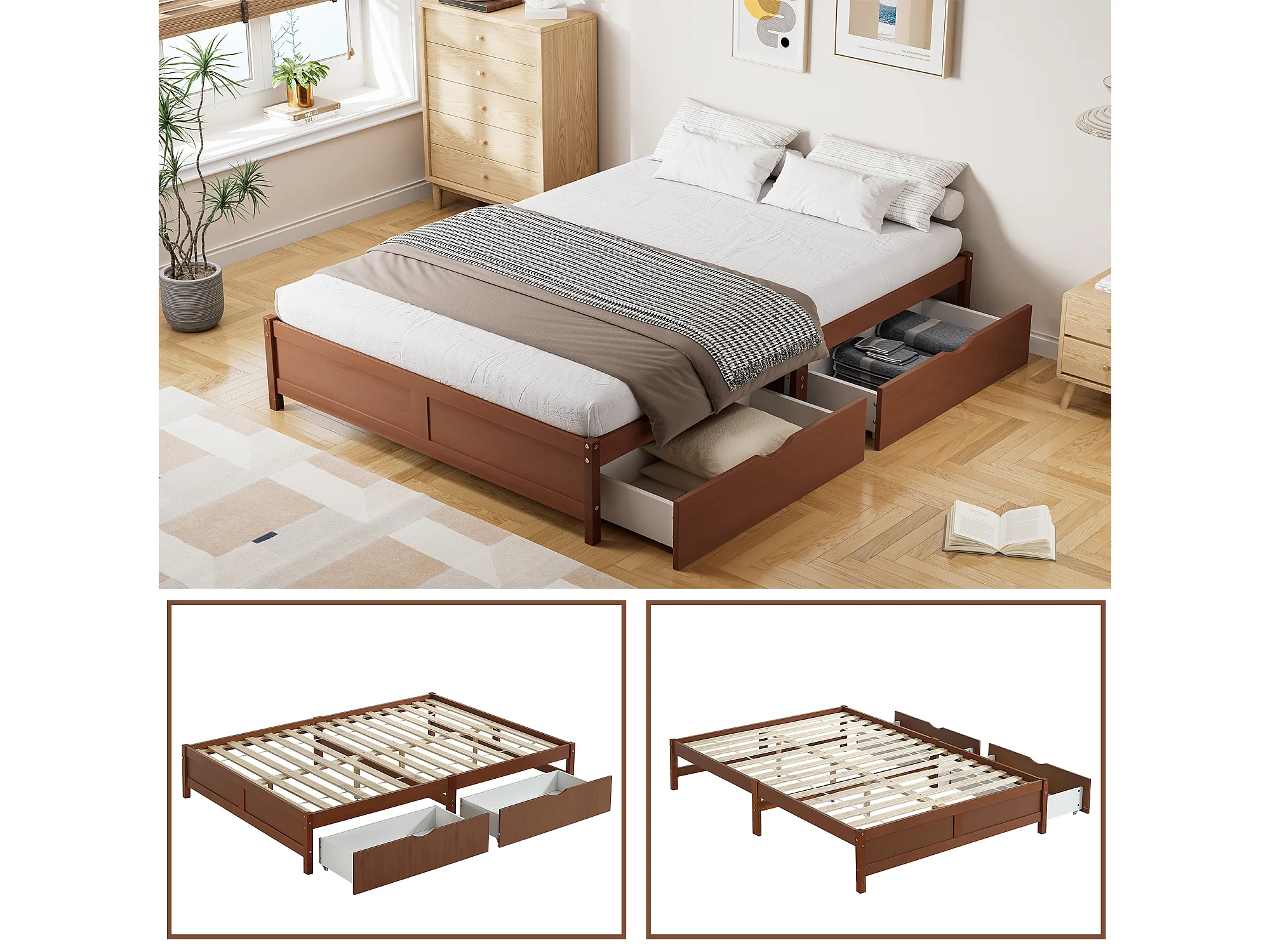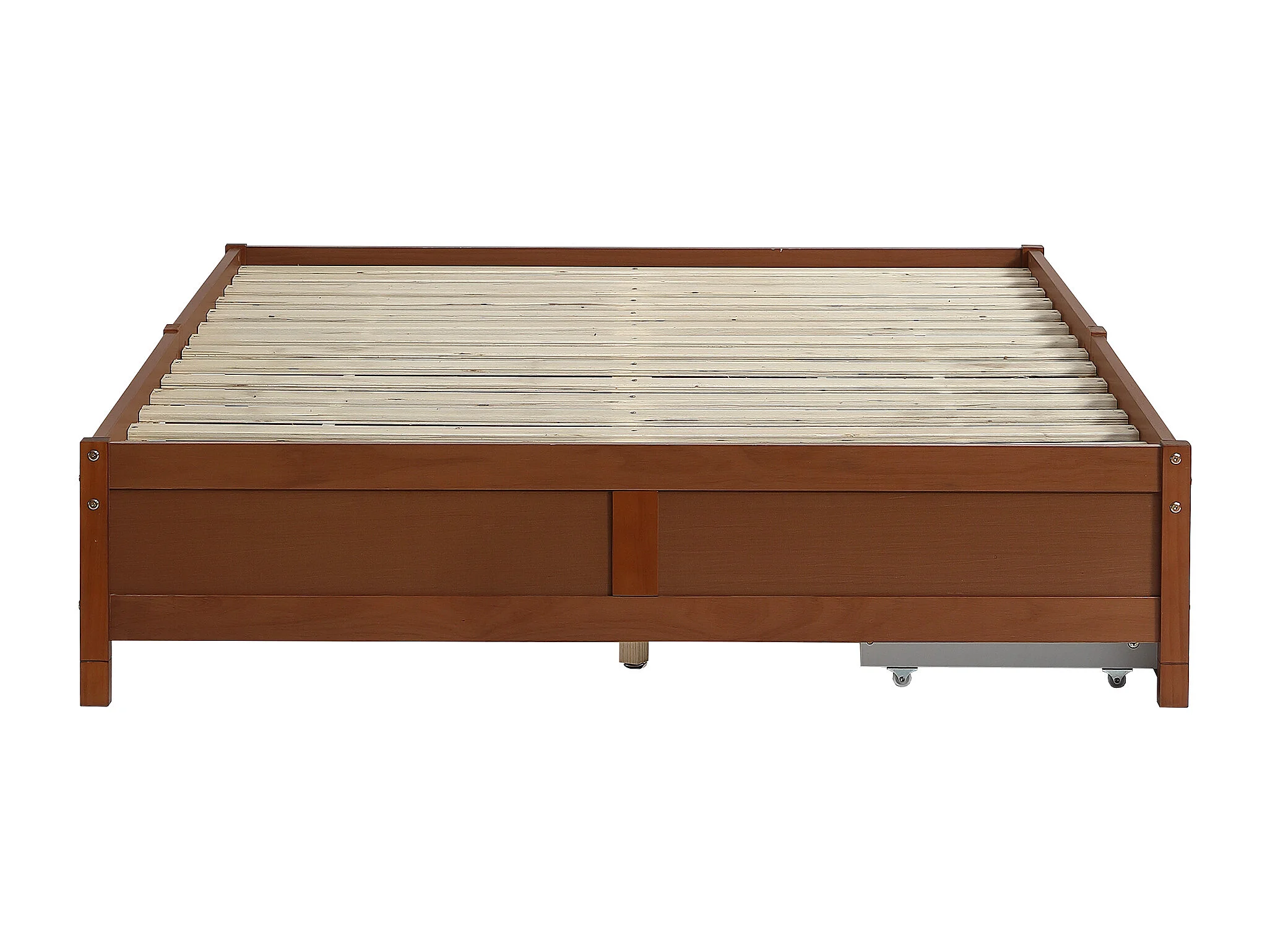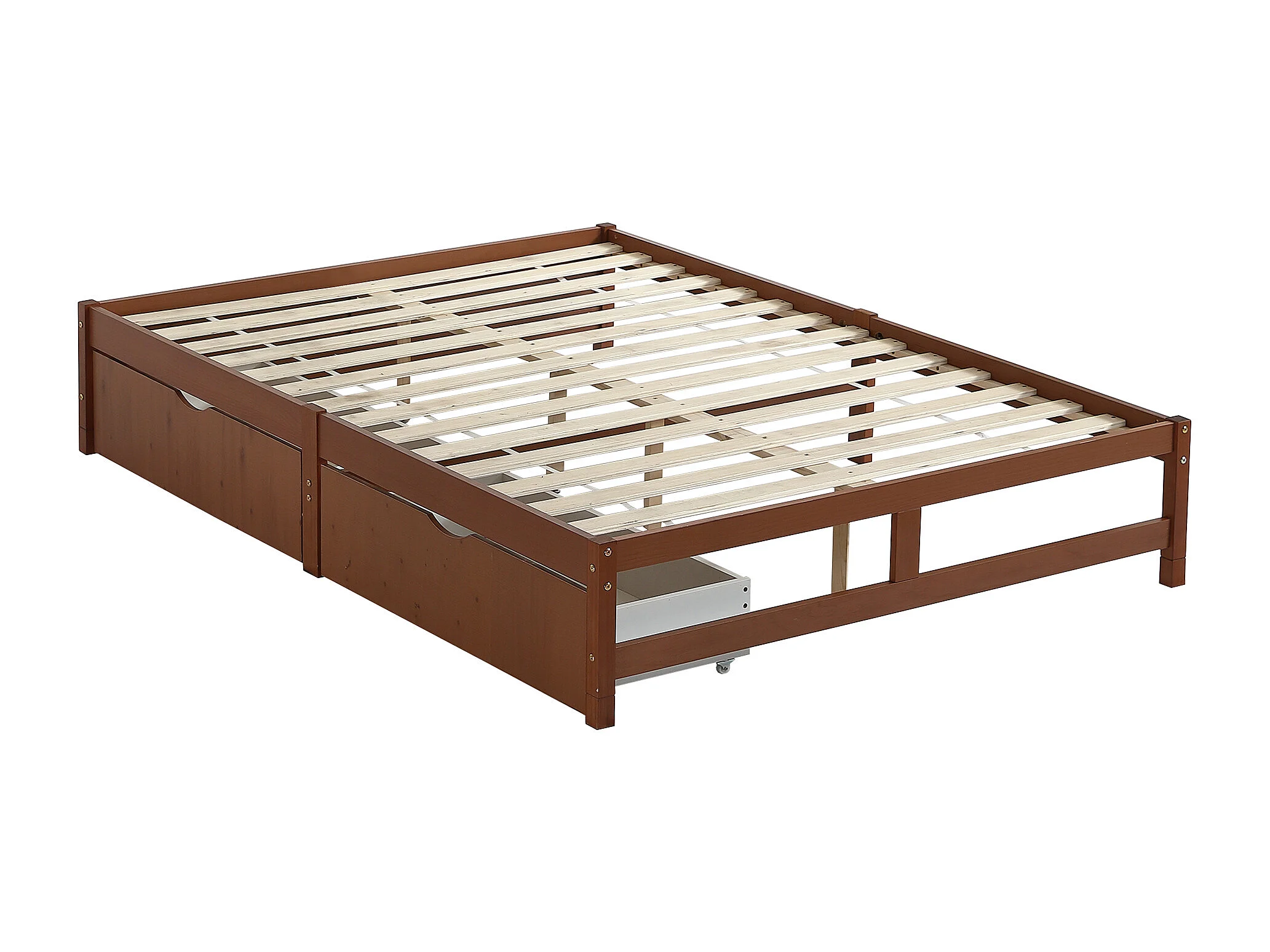 Bedframe 140x200cm - houten tweepersoonsbed met 2 lades op wielen met lattenbodems zonder hoofdbord - roodbruin