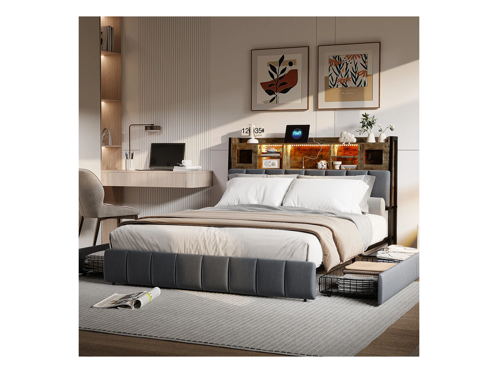 Tweepersoonsbed 140x200 cm met led-verlichting, metalen frame, 2 lades, hoofdbord met opbergruimte, lattenbodem