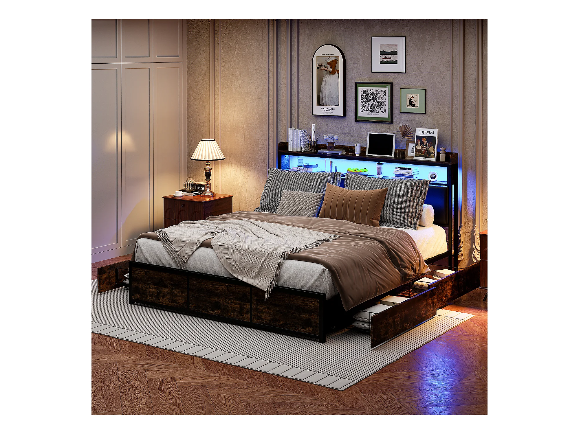 Bedframe 180 x 200 met metalen onderstel, tweepersoonsbed met opbergruimte en led-verlichting, PU, zwart
