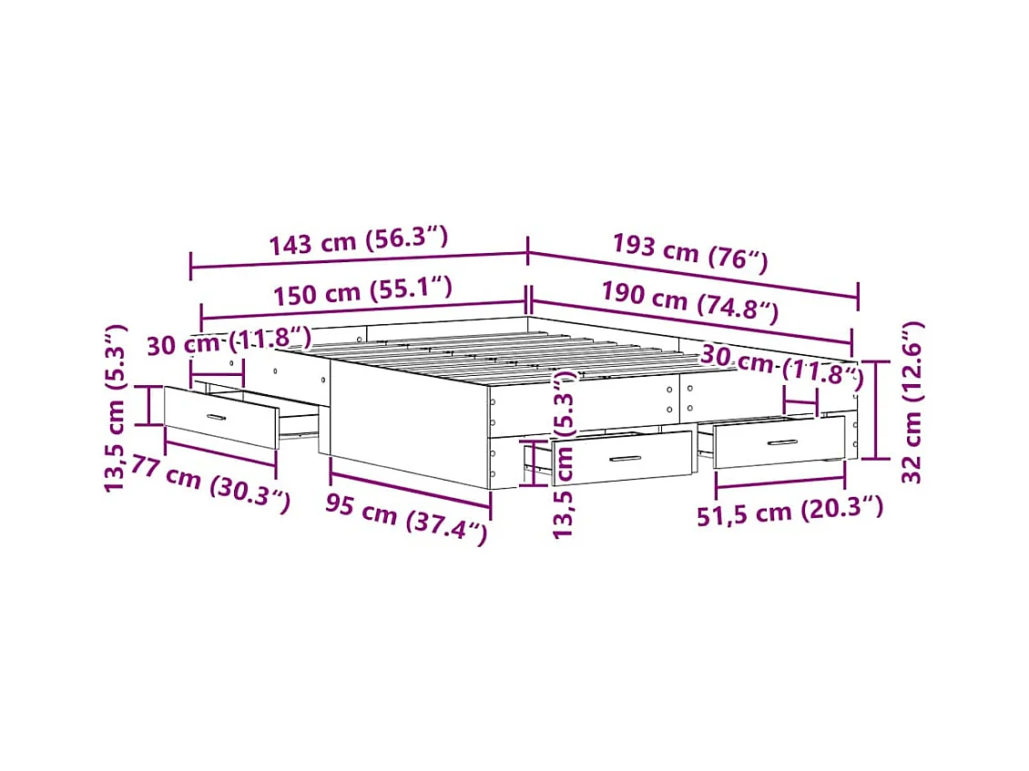 Bedframe met lades met lade Zwarte eik 140 x 190 cm