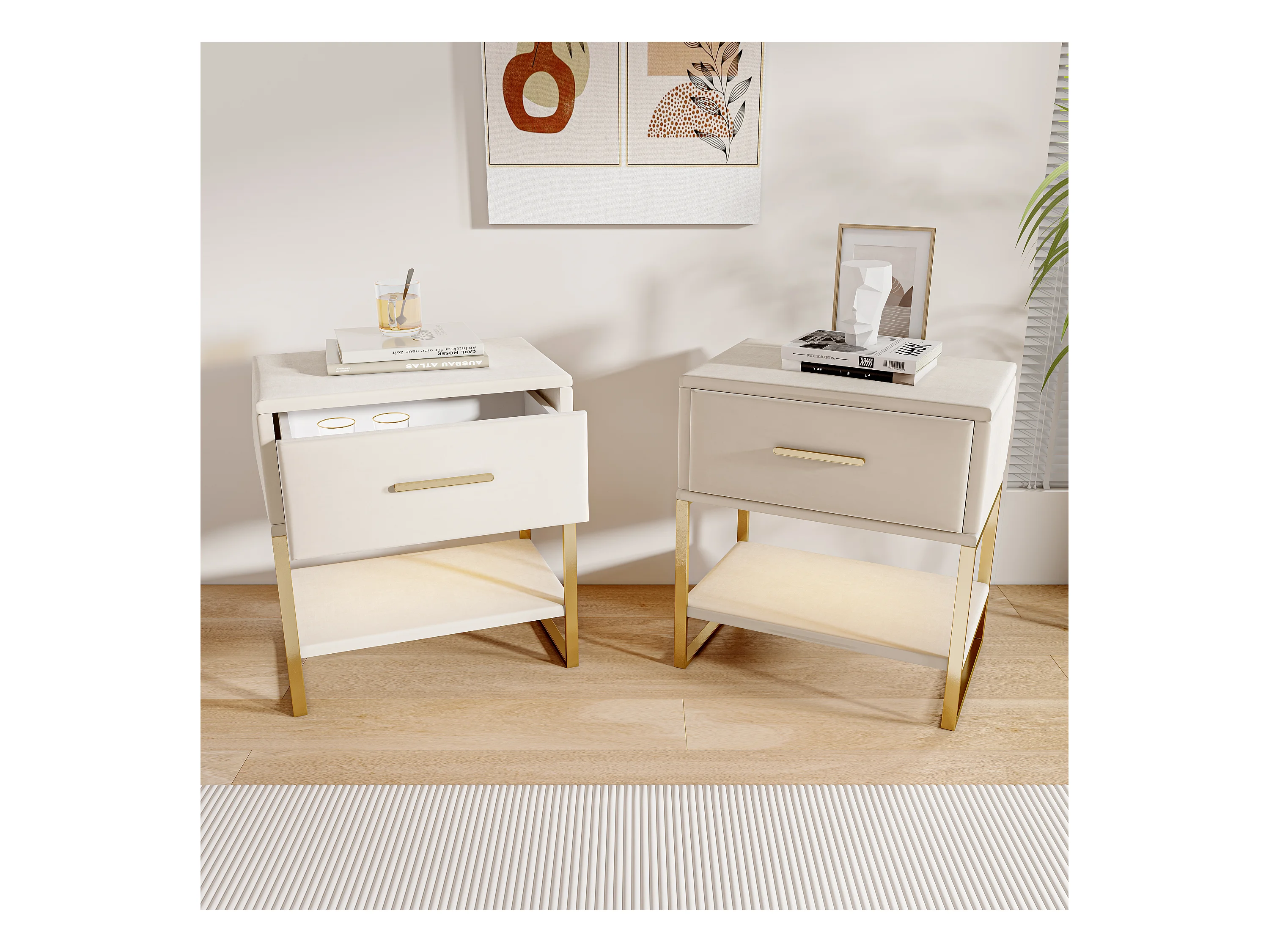 Modern beige nachtkastje met twee lades en goudkleurige metalen poten, fluwelen stof