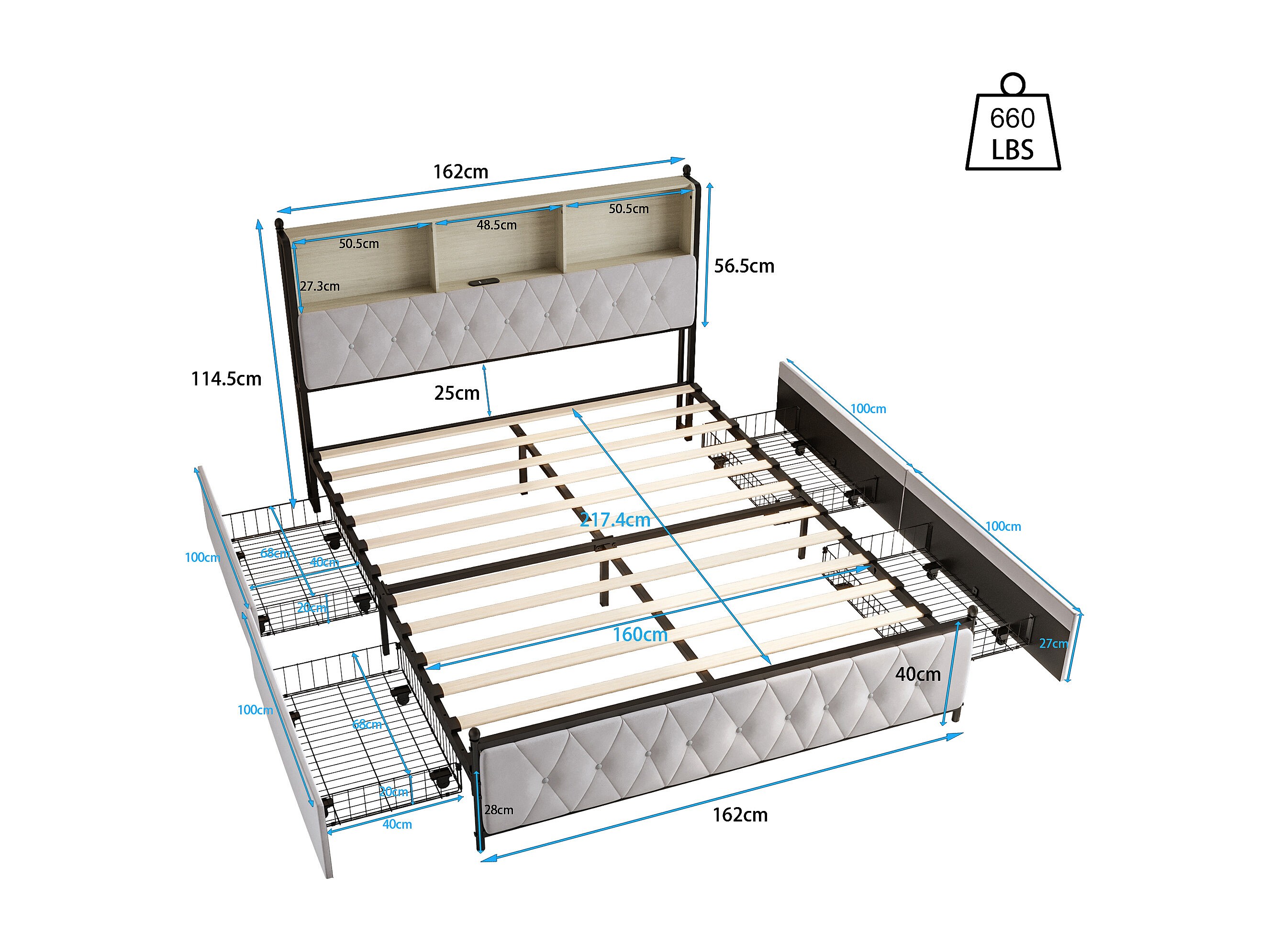 4 ruime lades onder het bed (2 aan elke kant), gemonteerd op wieltjes, perfect voor beddengoed, kleding of accessoires.