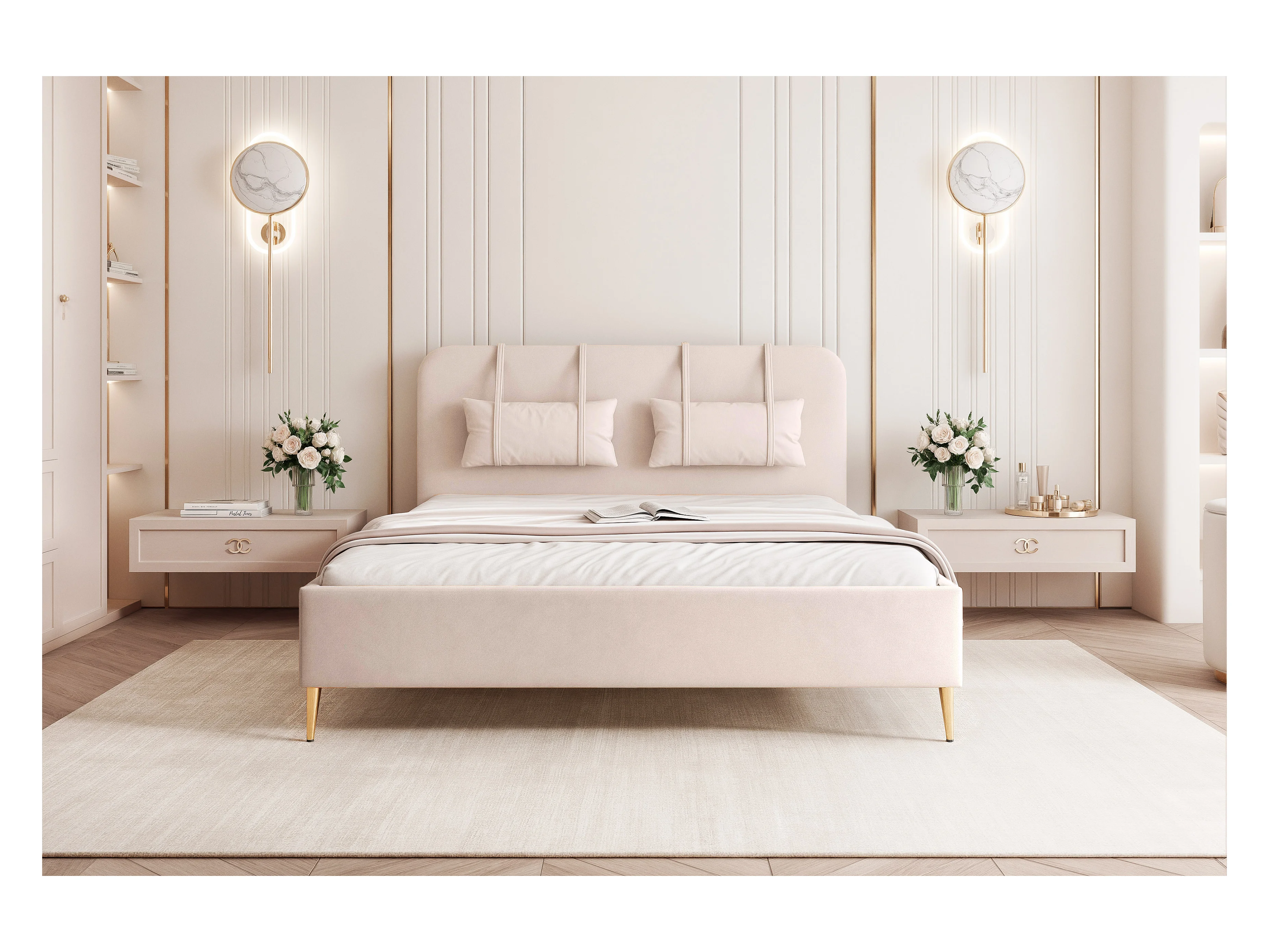 BESILIO Bed op gouden poten 180x200 Monti II – slank bed met afneembare sierkussens, metalen poten, lattenbodem en opbergruimte voor beddengoed – Crèmekleurig
