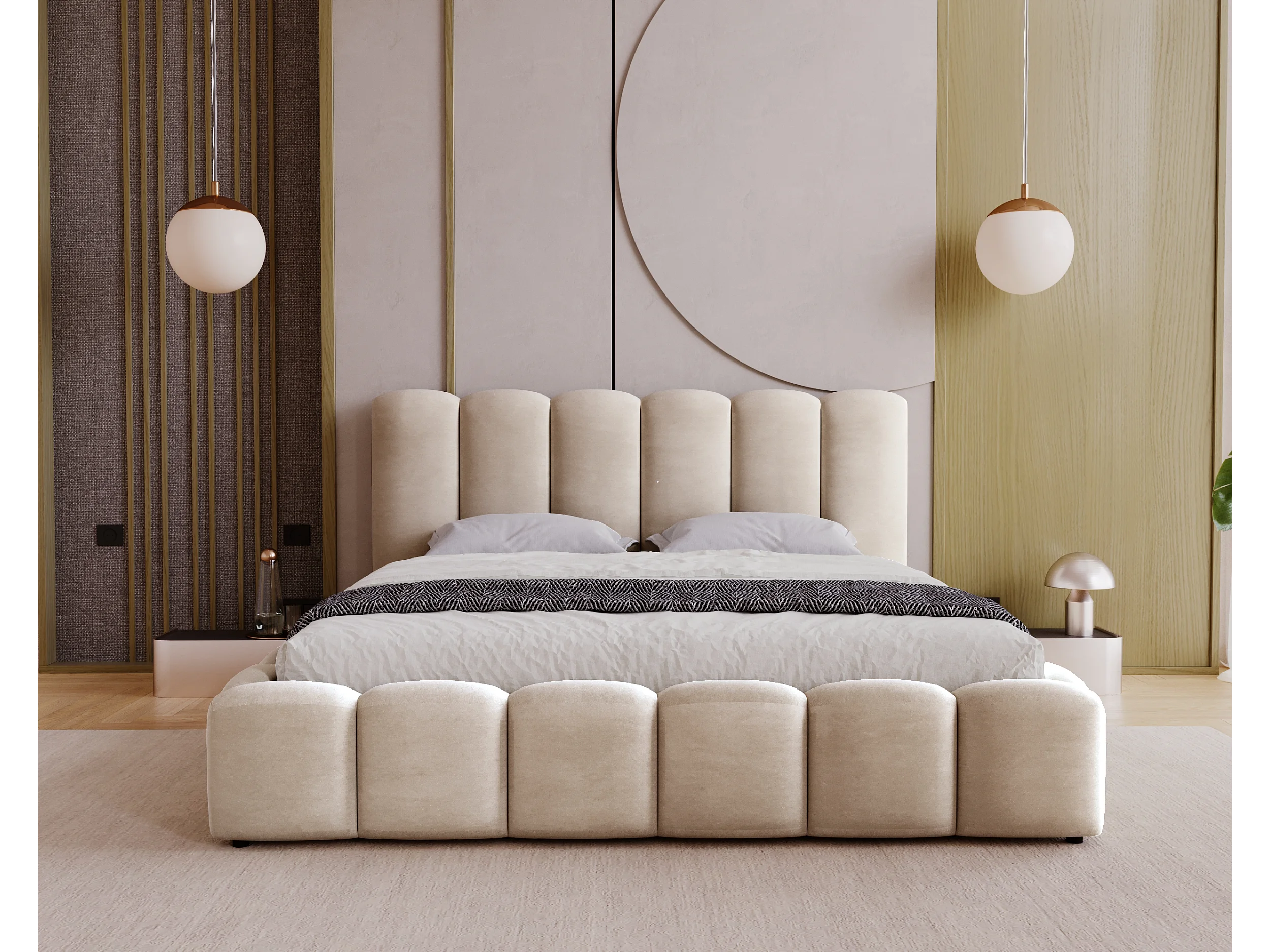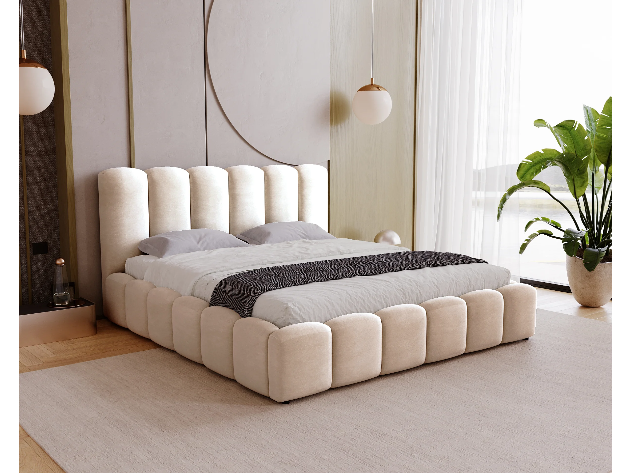 BESILIO Zacht gestoffeerd bed 160x200 Julien – bed met opbergruimte, afgerond design, dichte verticale banen – Beige
