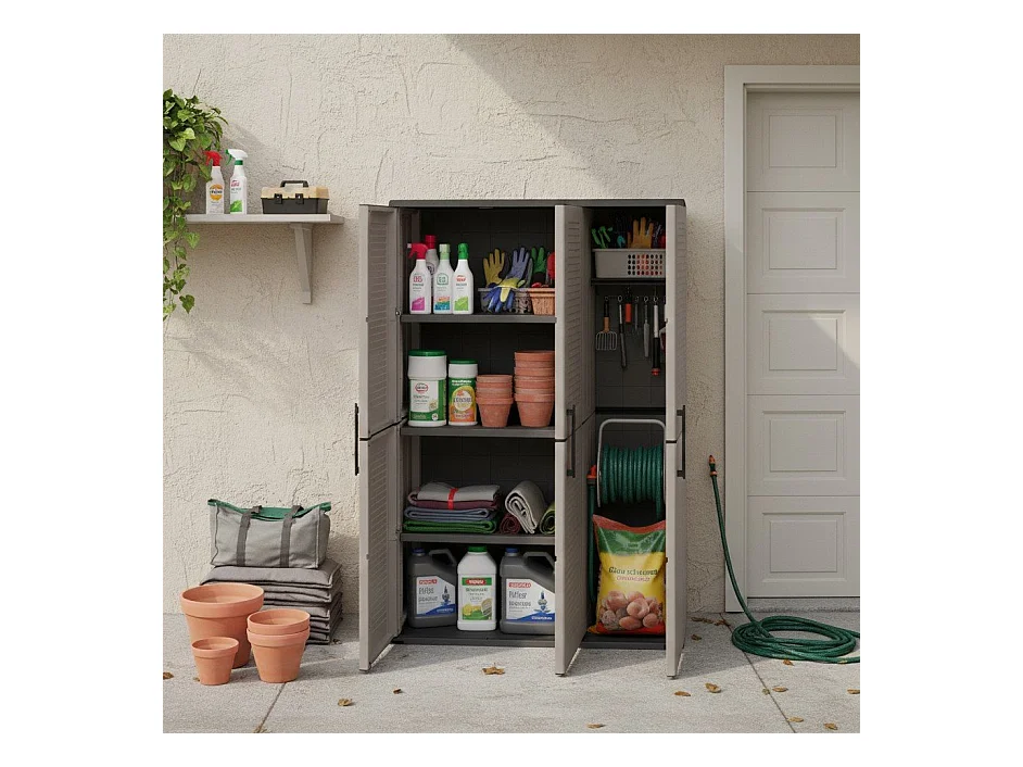 Dbirindell buitengarderobe, multifunctionele balkongarderobe, 2-deurs buitenkast, 100% gemaakt erinAly, 68x37h90 cm, Lichtgrijs & Zwart, Geruite afwerking