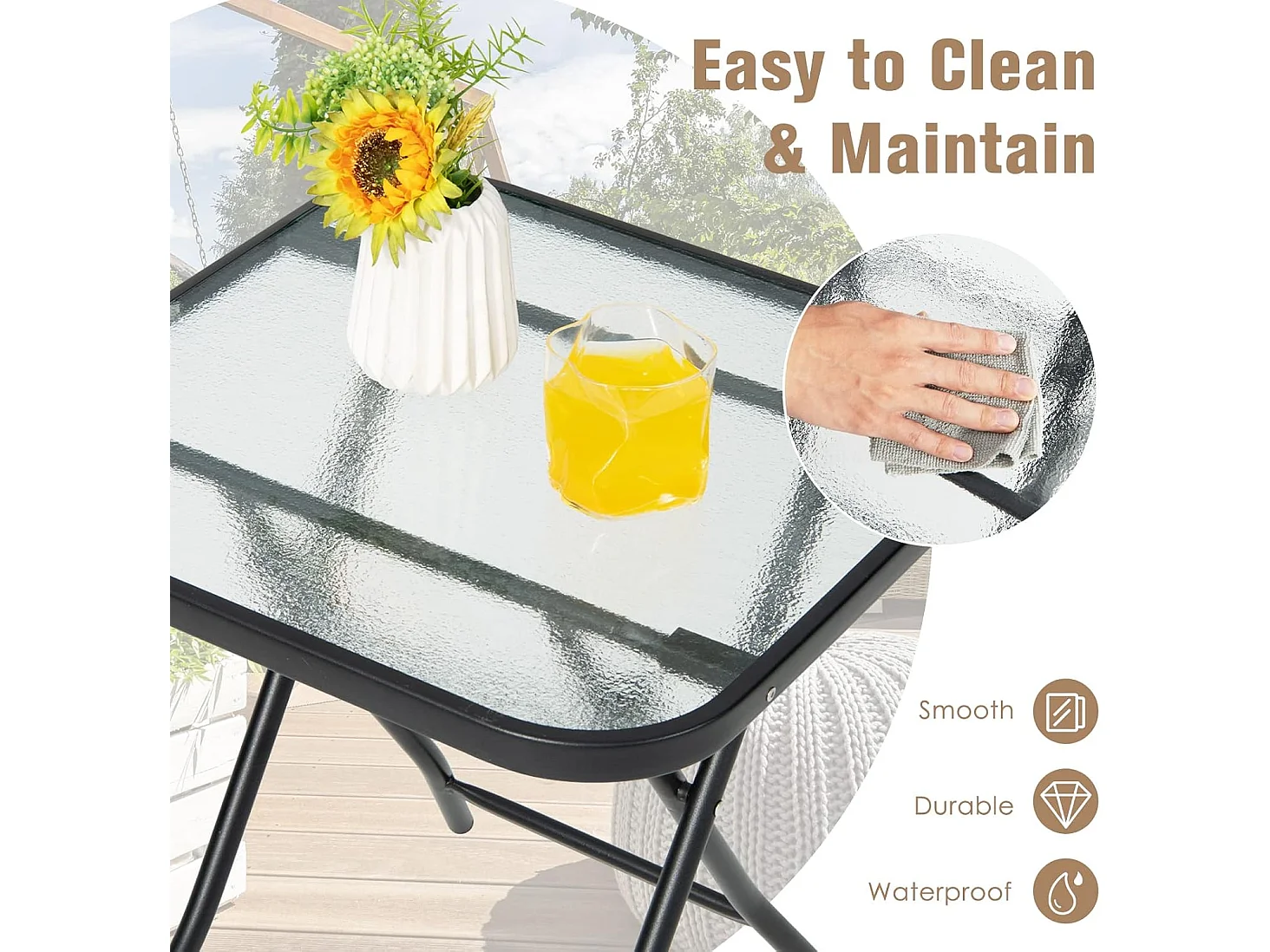 Bijzettafel, kleine tuintafel, balkontafel met tafelblad van gehard glas, koffietafel voor woonkamer, tuin, balkon, terras, 43 x 43 x 45 cm
