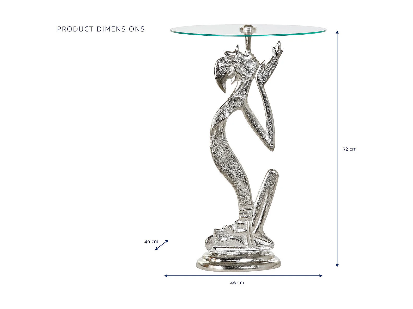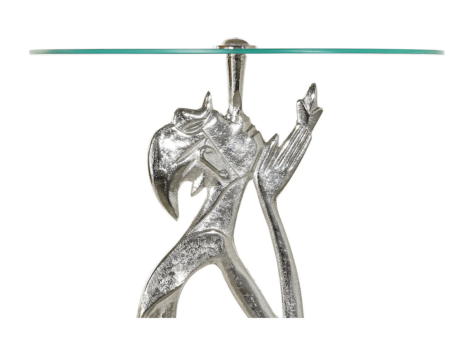 Bijzettafel van aluminium en glas, 46x46x72 cm, voor één persoon.