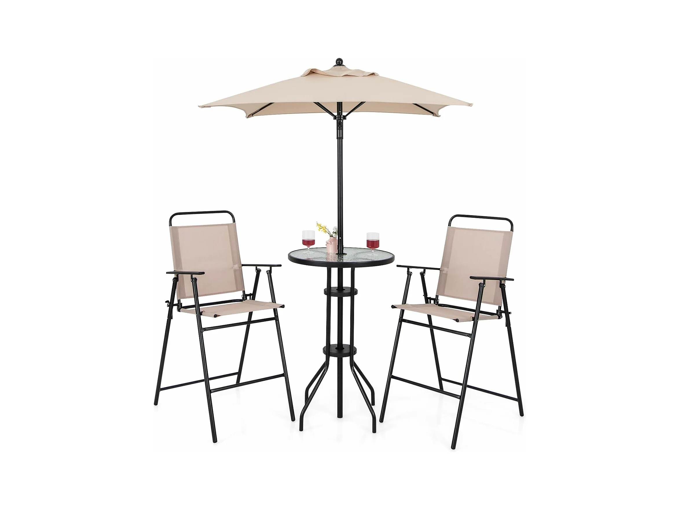 Bistrotafel met 2 inklapbare stoelen en parasol, 4-delige balkonmeubels, balkonset, tuinmeubelset, zitgroep, tuingarnituur voor tuin, balkon, zwembad, beige ZB33570