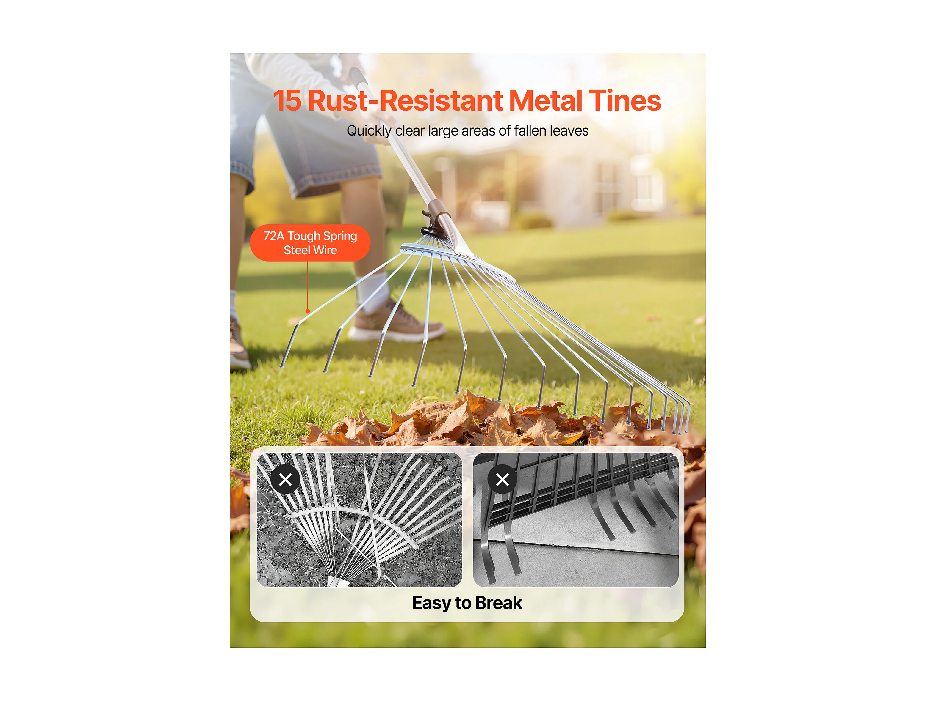 Bladhark SucceBuy, 15 Metalen Tanden, Verstelbare Tuinhark, met Kopstuk 19-57 cm, Lange Steel 81-160 cm, Robuust en Veilig, Buis uit RVS