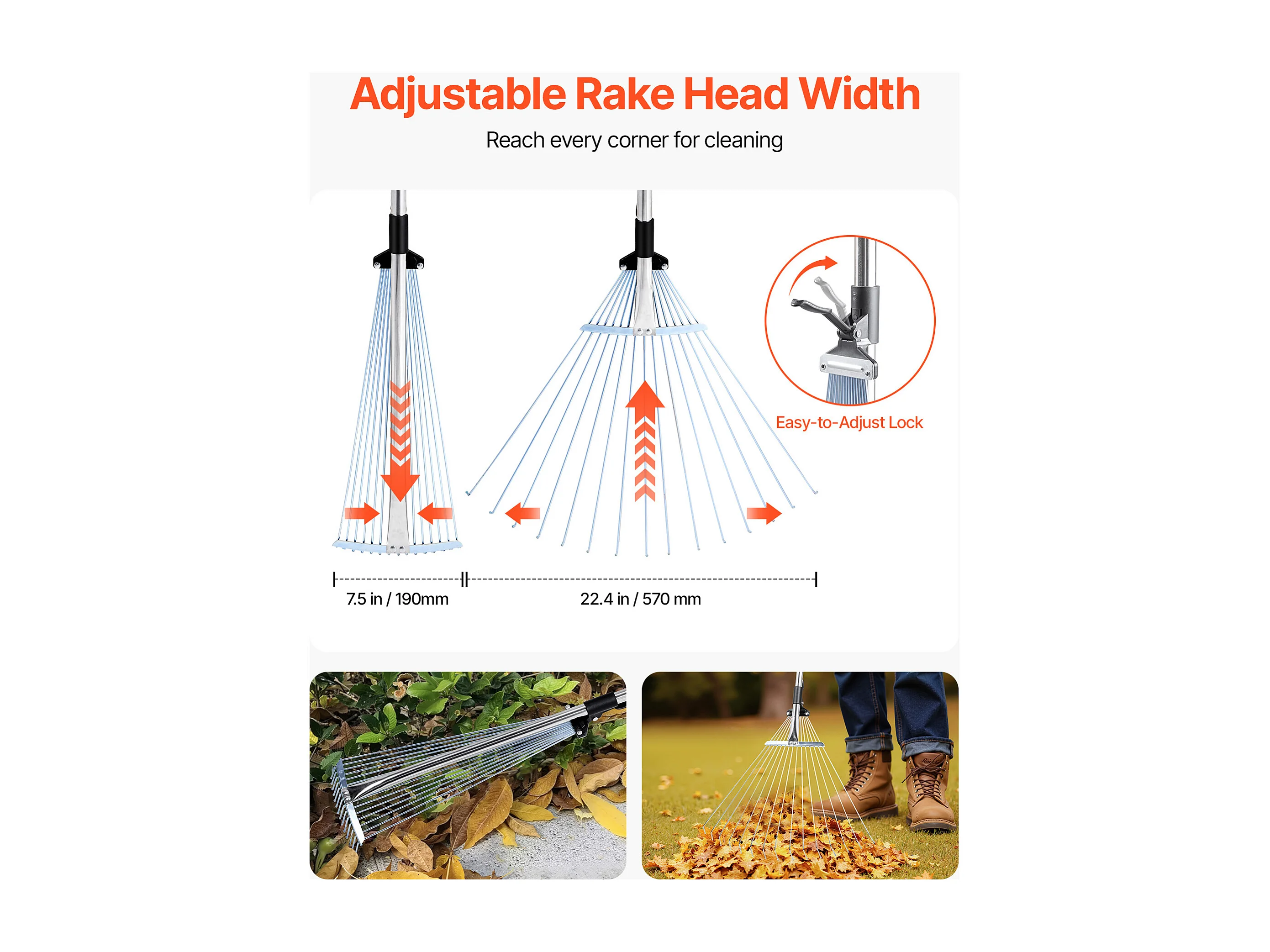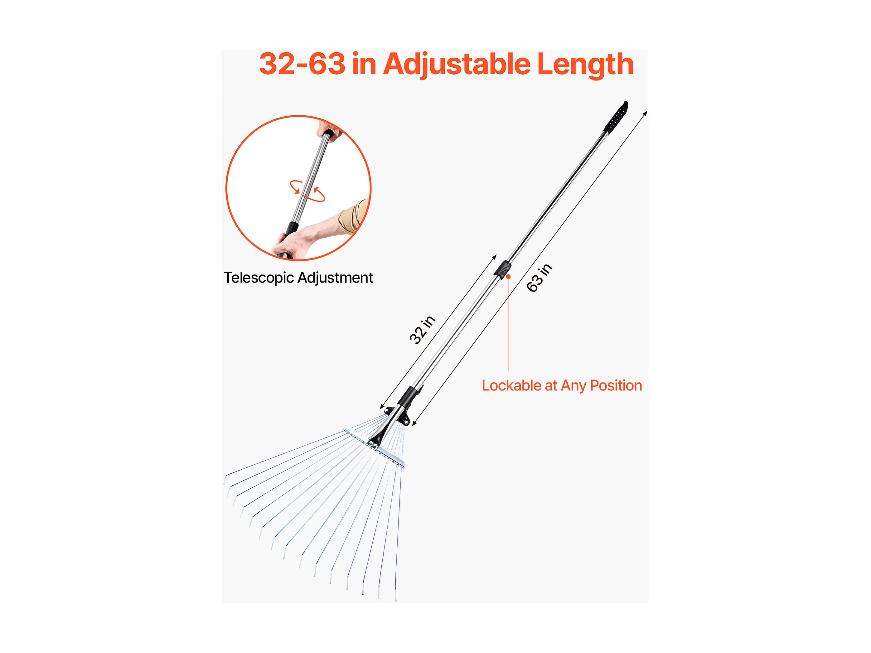 Bladhark SucceBuy, 18 Metalen Tanden, Verstelbare Tuinhark, met Kopstuk 19,5-43,5 cm, Lange Steel 82-141 cm, Robuust en Veilig, Buis uit RVS