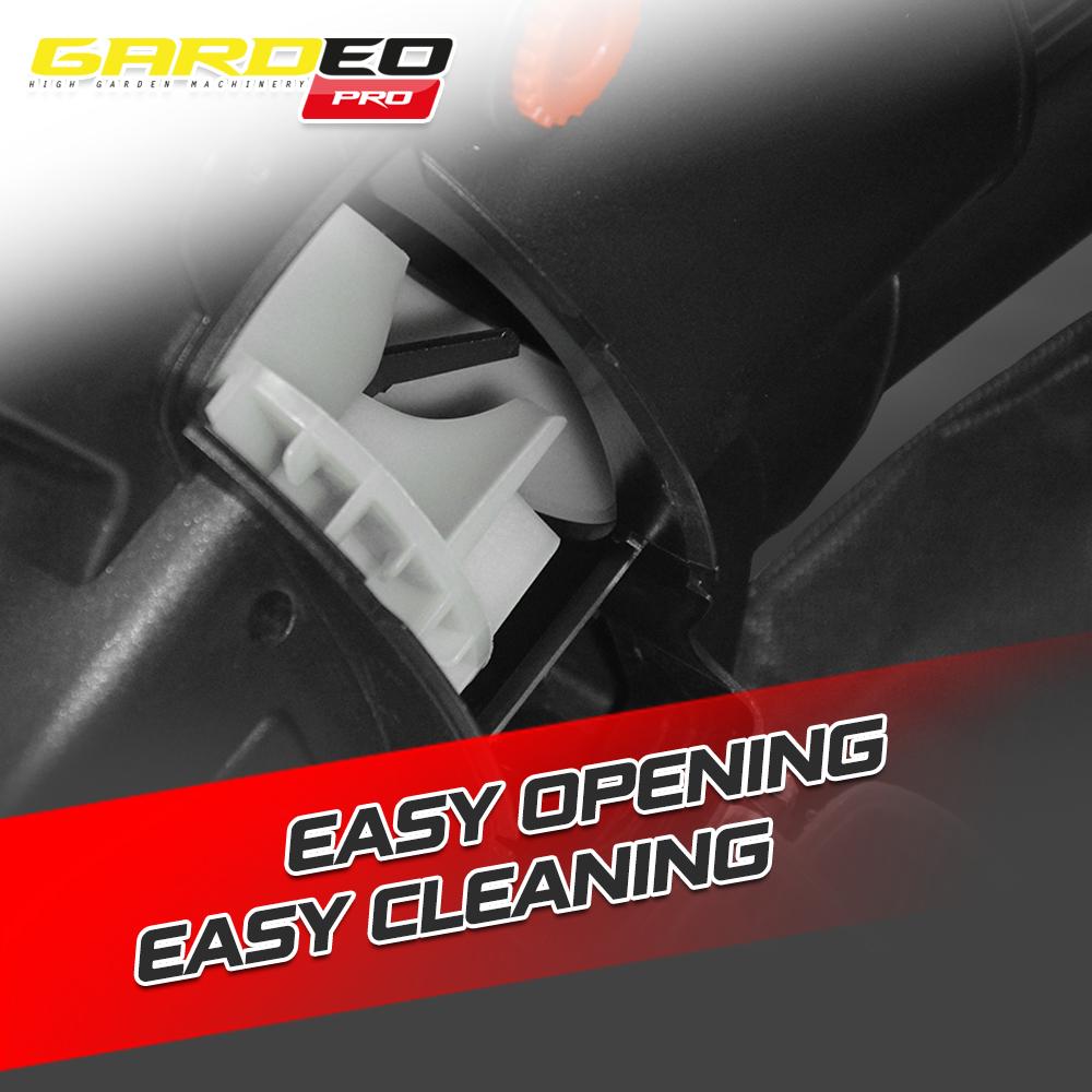 Heel praktisch, deze bladzuiger, bladblazer en versnipperaar heeft een snel openend kop systeem om het reinigen van het versnippersysteem te vergemakkelijken. Hij heeft ook een telescopische buis die u naar wens kunt aanpassen.