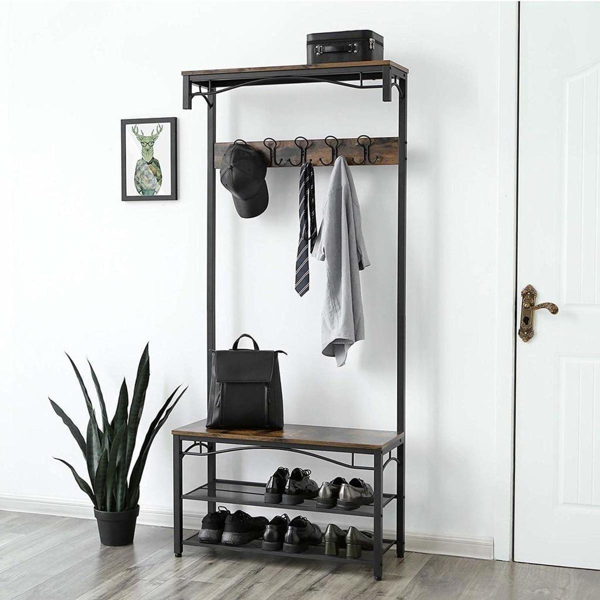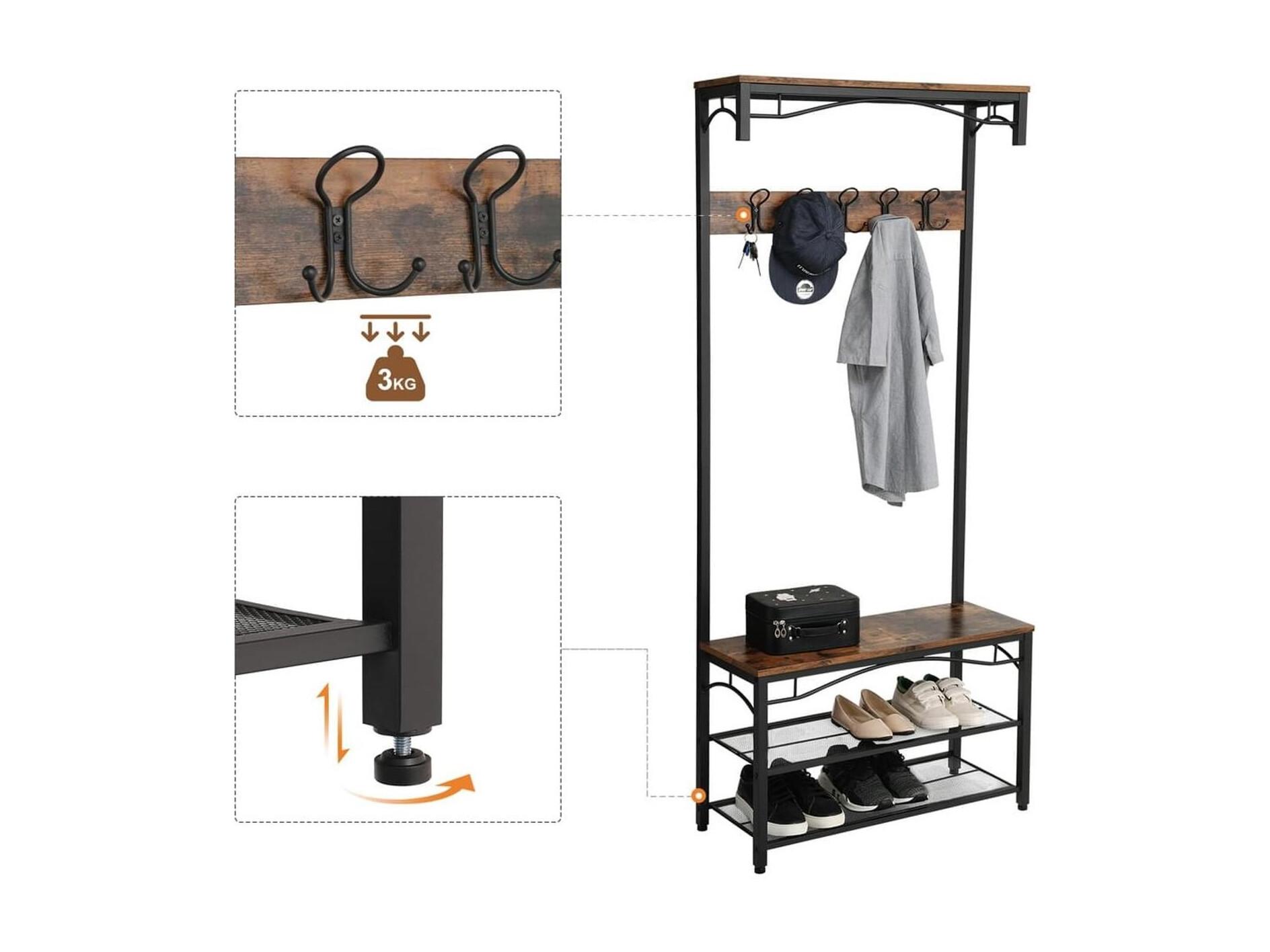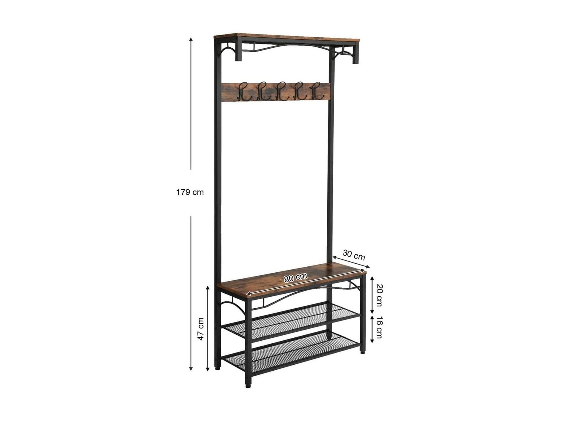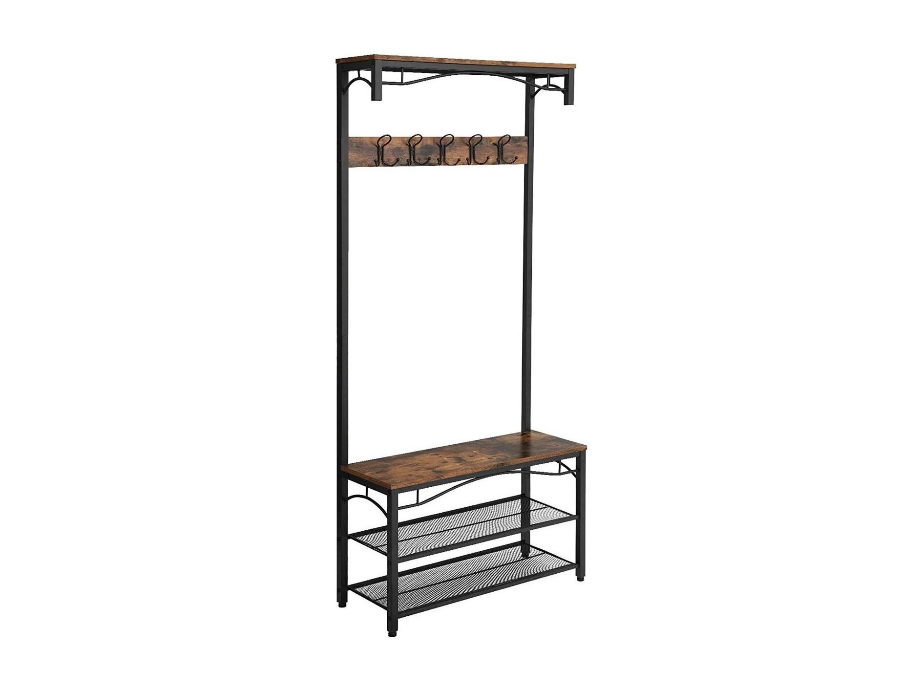 Kapstok met bankje en 9 haken, metaal en hout, industrieel design, walnootkleur (100x40x185 cm)