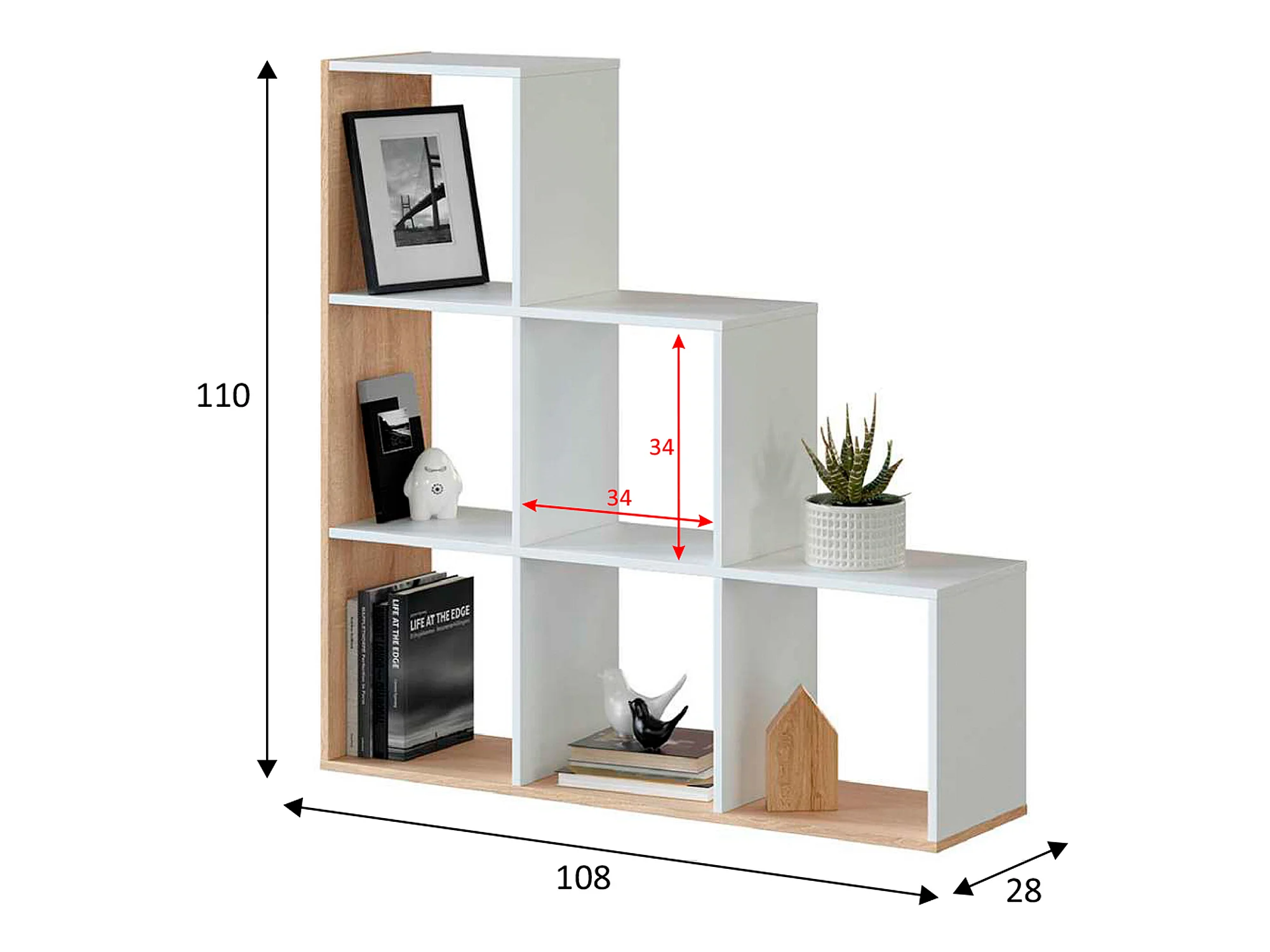 Dbarth Boekenkast, Dubbelzijdige boekenkast met 6 vakken, Kantoorverdeelplank, 108x28h110 cm, Wit en Eiken