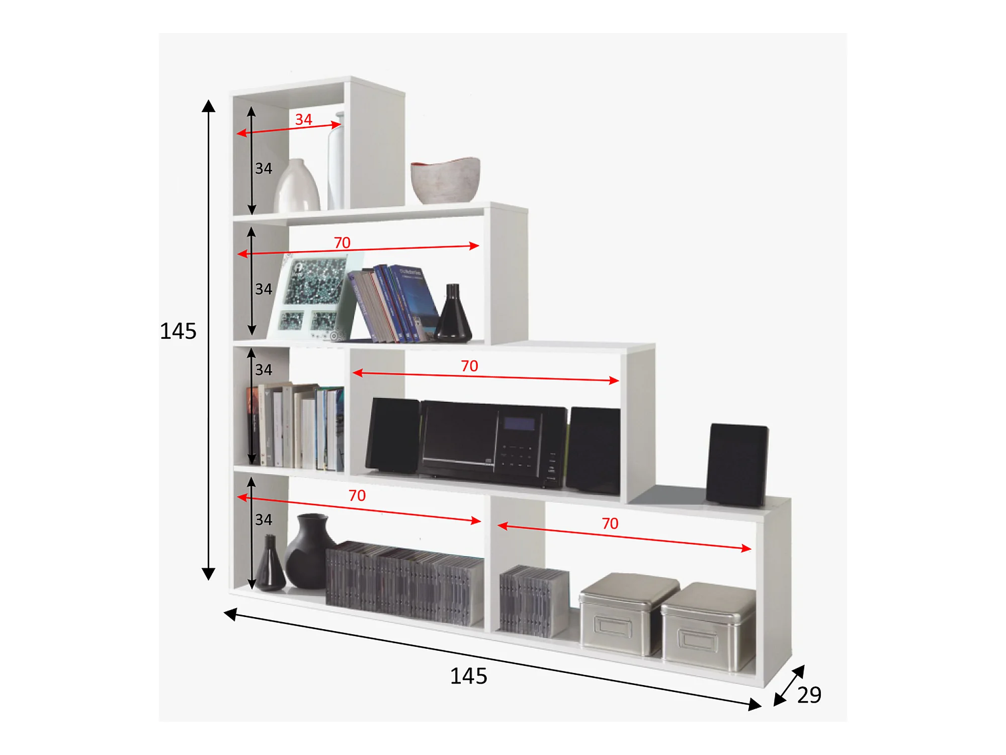 Dmorr boekenkast, Dubbelzijdige boekenkast met 6 planken, Verdeelplank met kantoorvakken, 145x29h145 cm, Glanzend wit