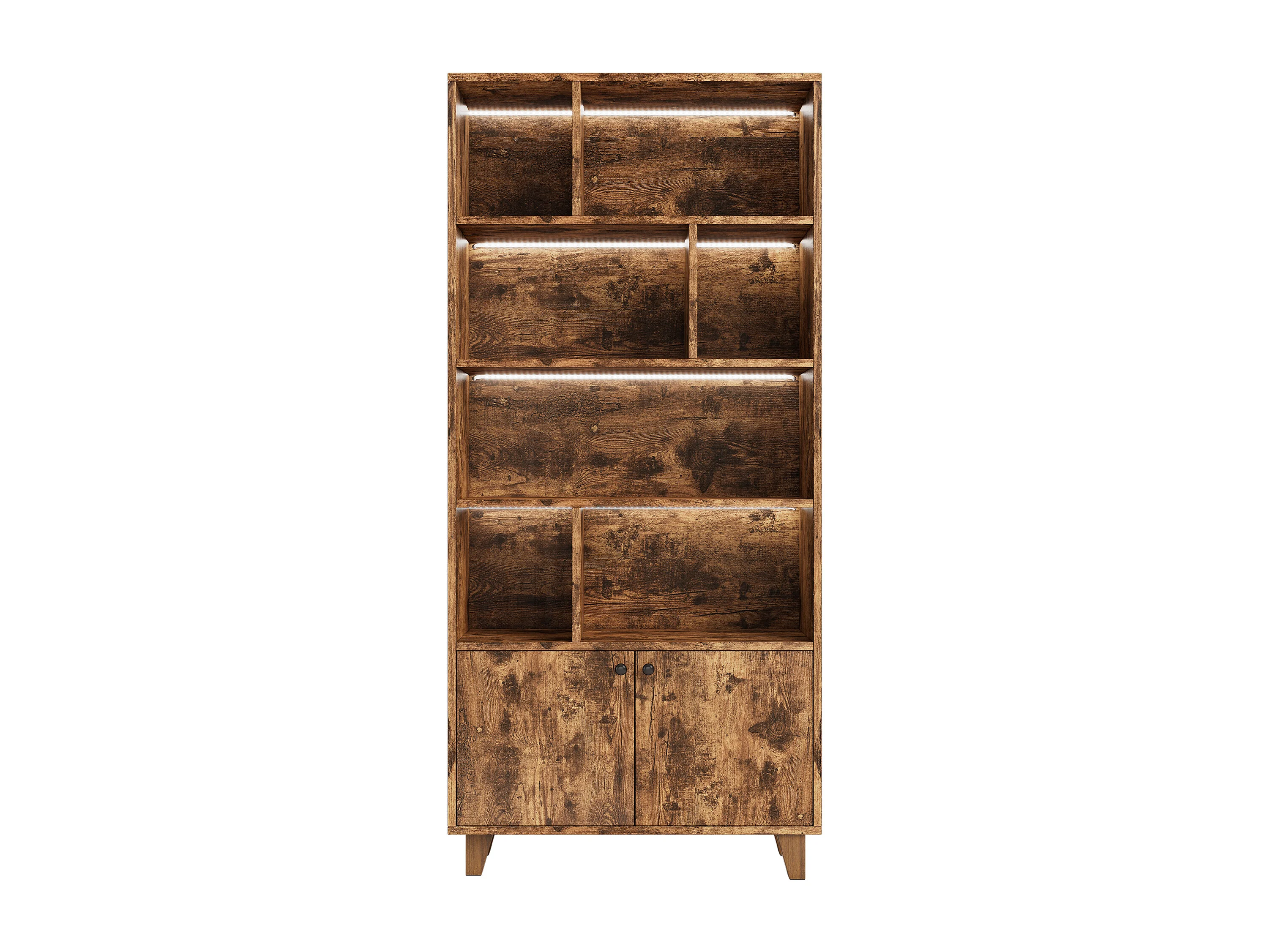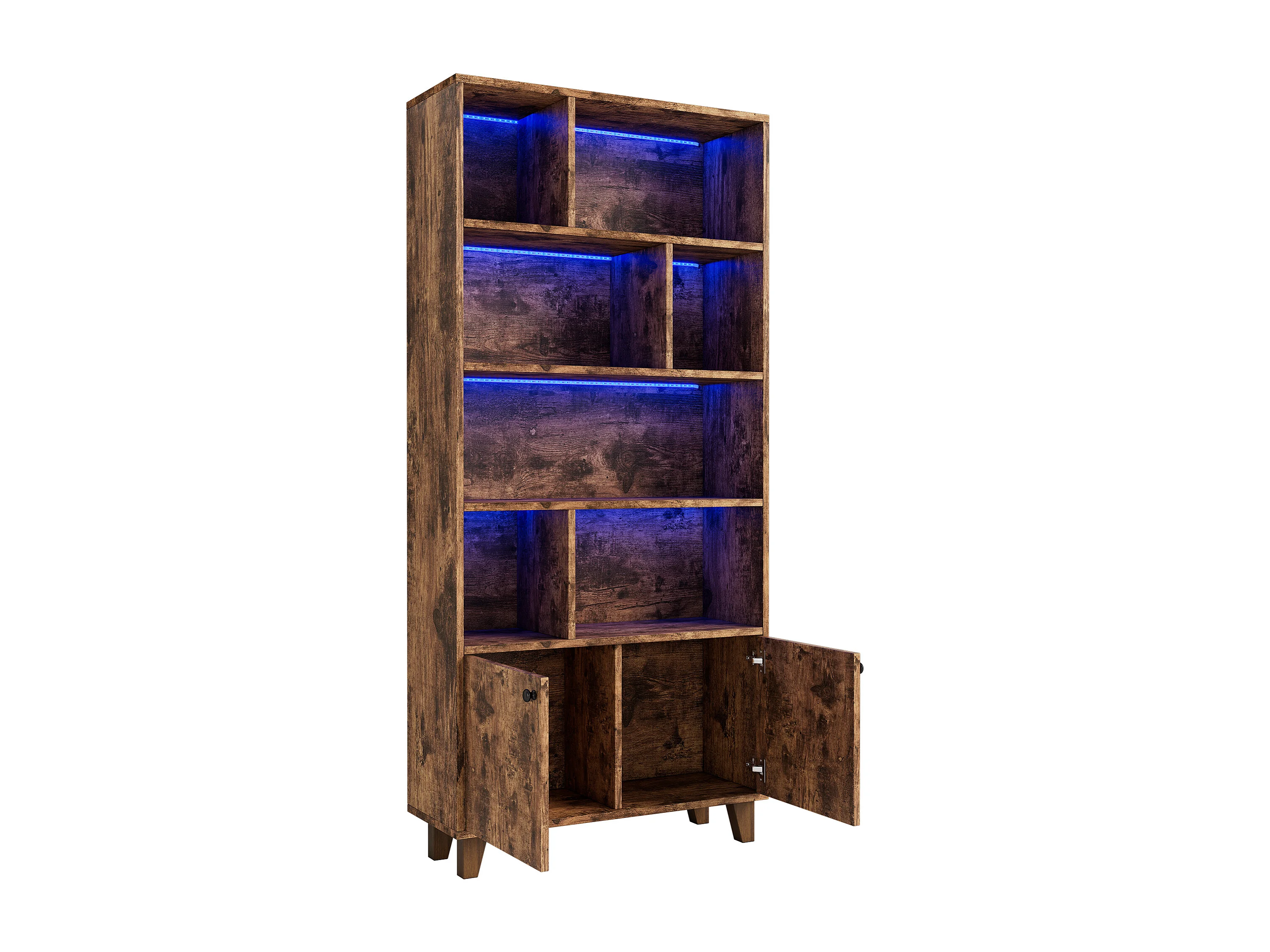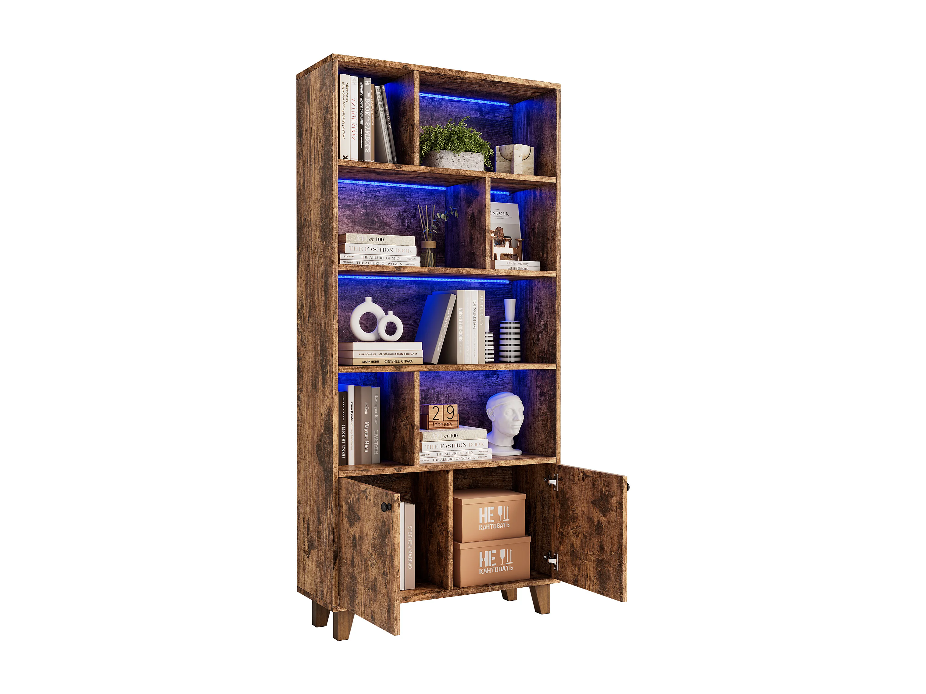 Moderne boekenkast - 80 x 30 x 173 cm - met meerdere opbergruimtes + 2 deuren + LED's - Massief hout + MDF - bruin