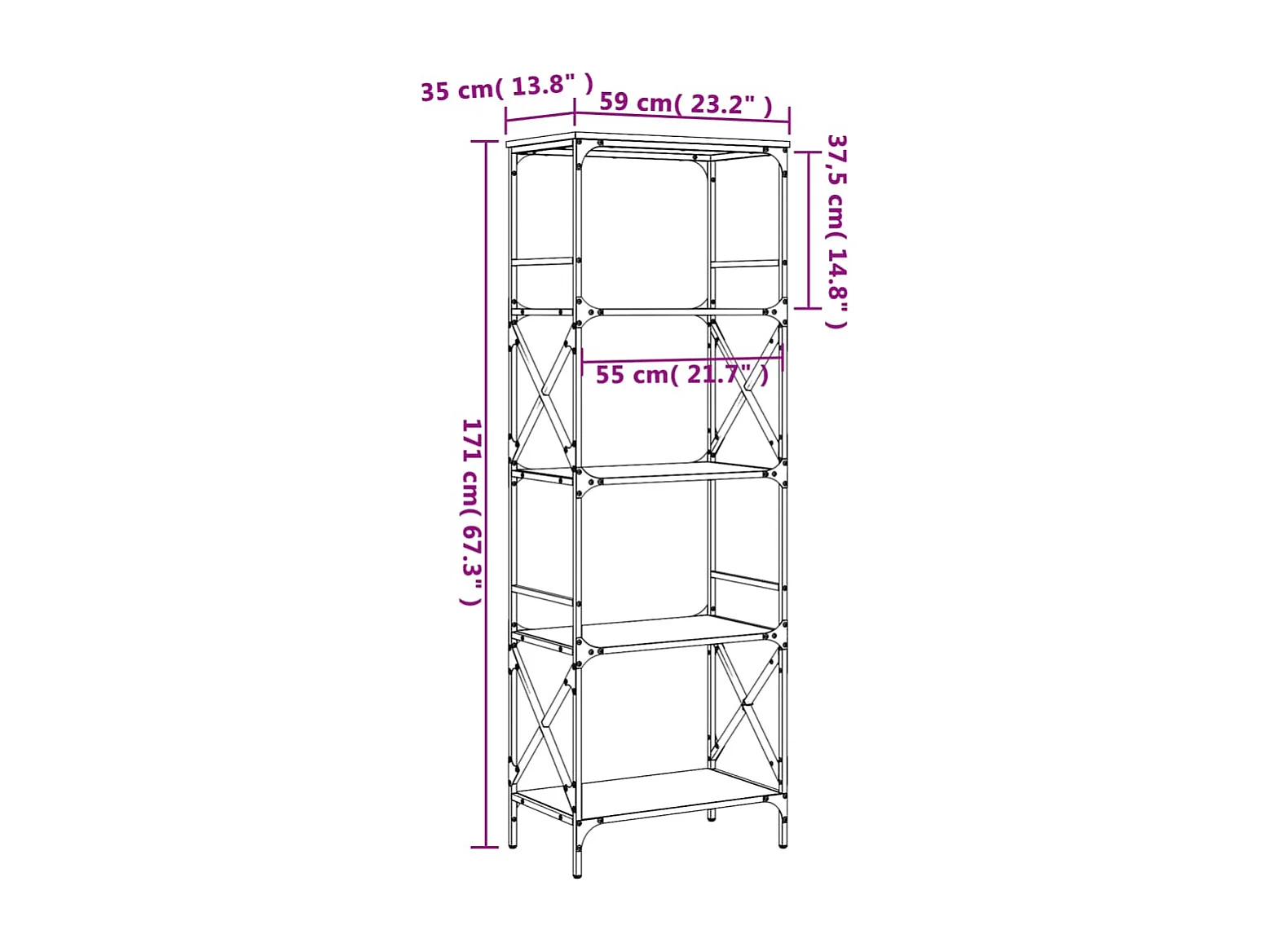 Boekenkast met 5 niveaus, bruin eiken, 59x35x171 cm