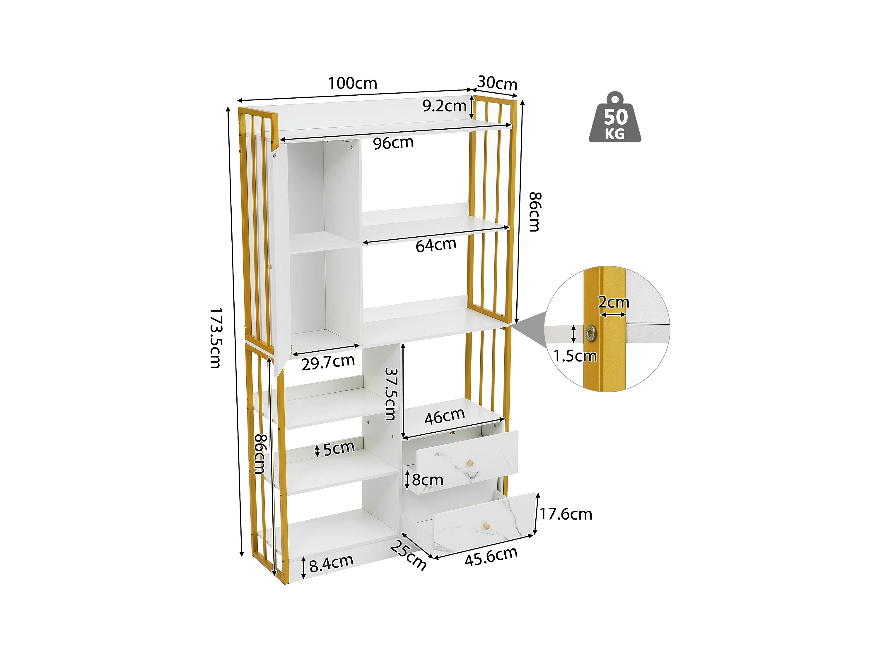 Boekenkast met 6 planken, verticale planken met deuren en laden, industriële metalen planken (100x30x173,5 cm)