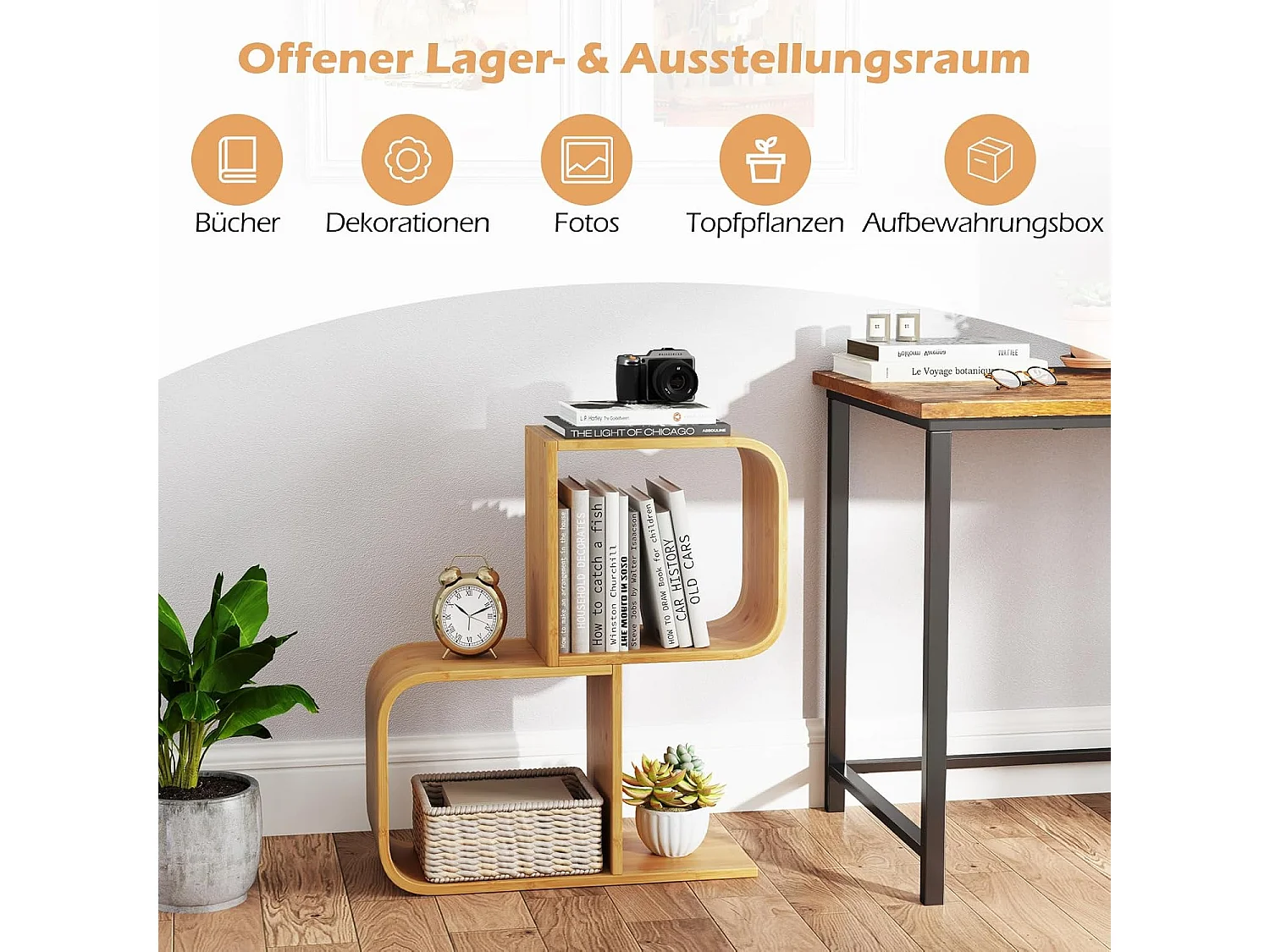 Boekenkast, S-vormig, staand rek van bamboe met 2 niveaus, kantoorrek, decoratief rek voor woonkamer, werkkamer, thuiskantoor, natuur, 61 x 23 x 66,5 cmVH33117