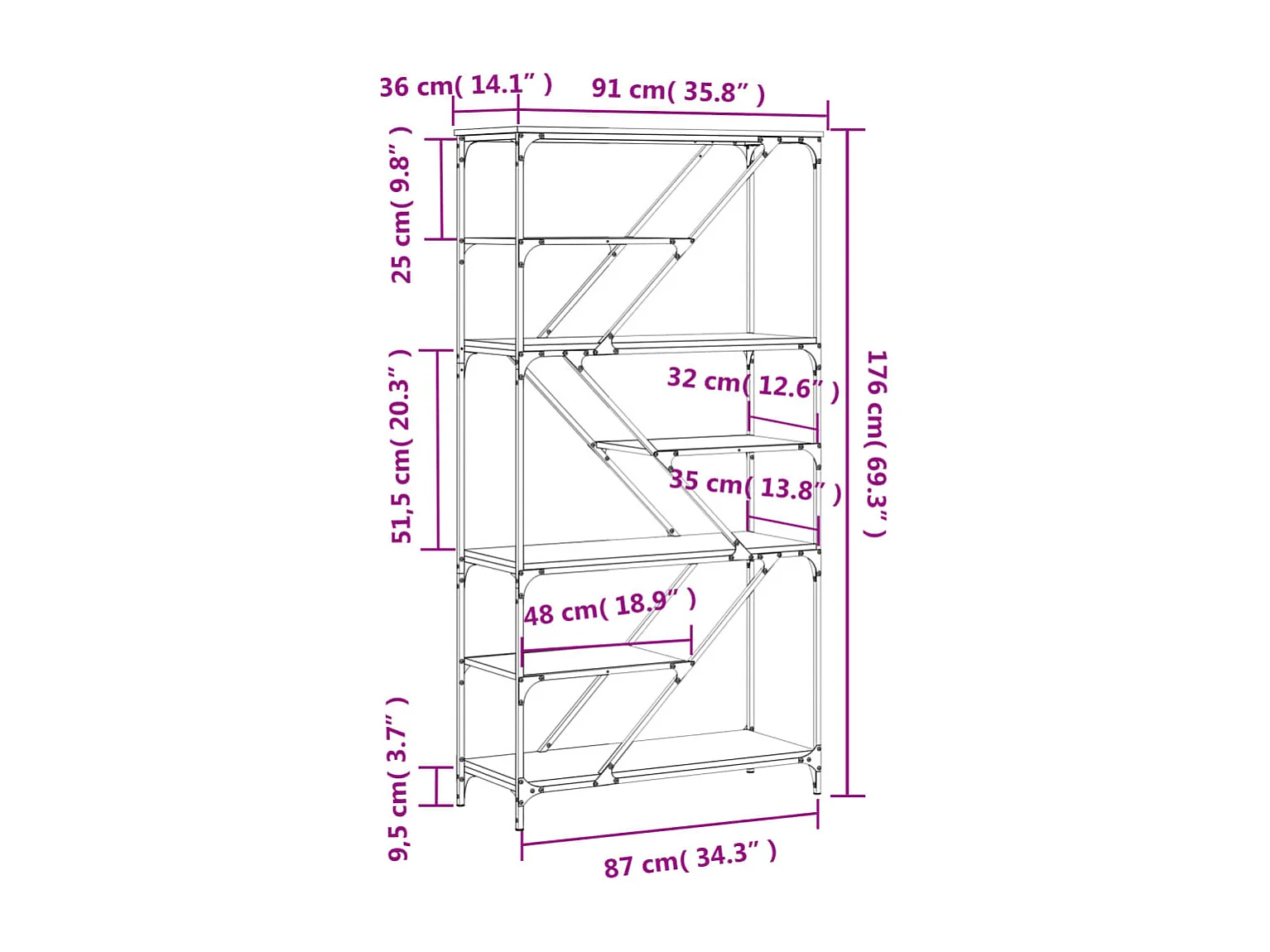 Boekenrek 91x36x176 cm bewerkt hout en staal bruin eikenkleur