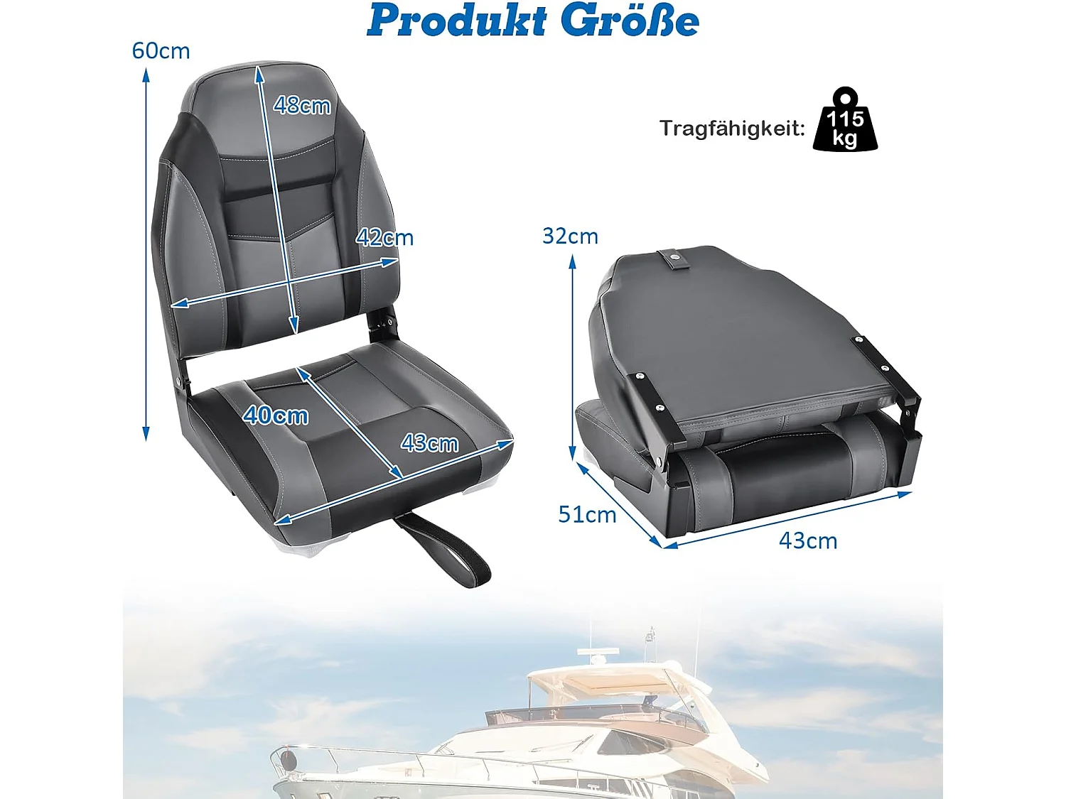 Set van 2 bootstoelen inklapbaar, bootstoel met 11 cm dikke sponsvulling, gevoerde stuurstoel, blauw-wit, 50 x 42 x 52 cmZB32669