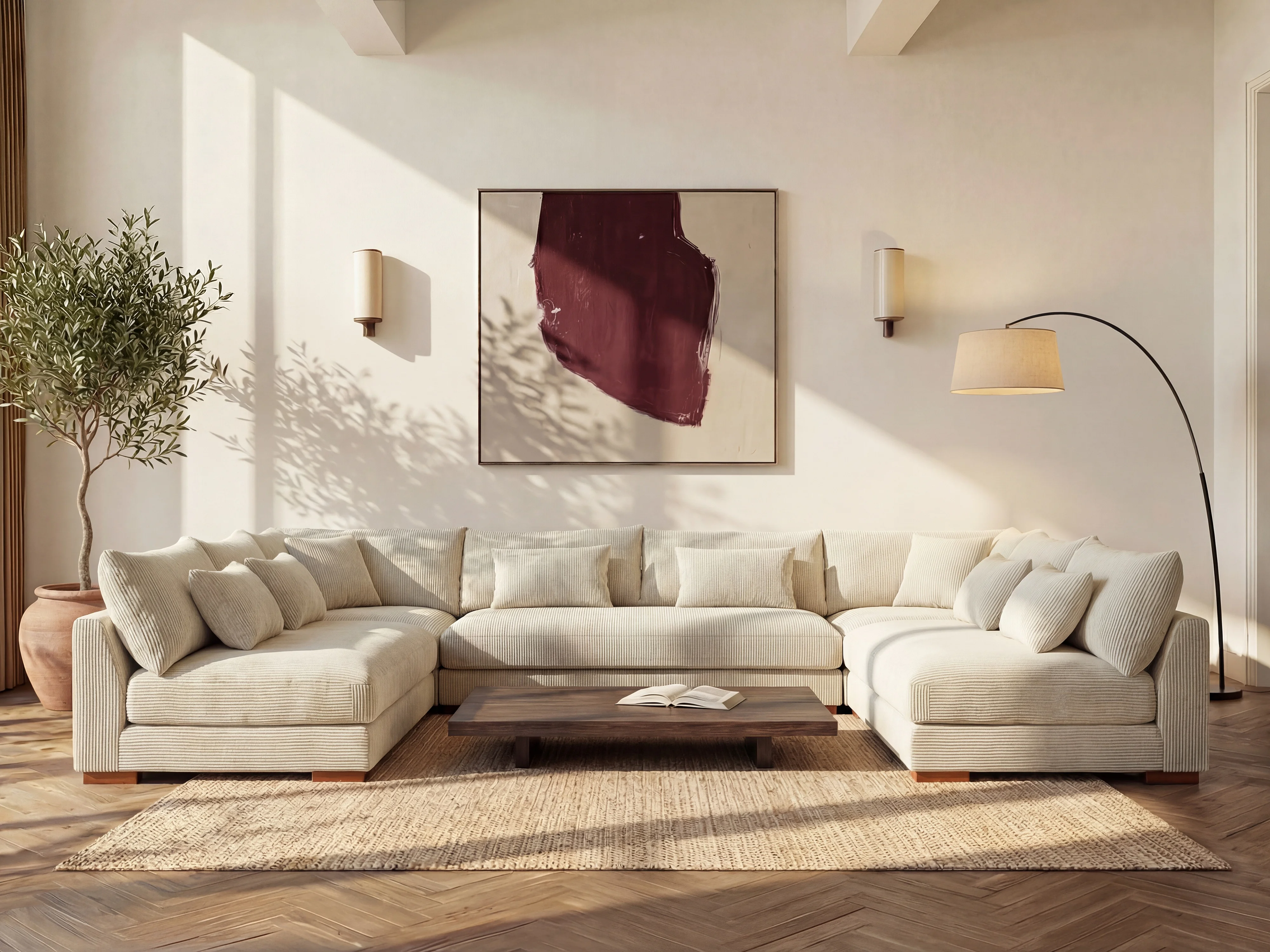 XXL-hoekbank met hoek links van beige ribfluweel SPERONE