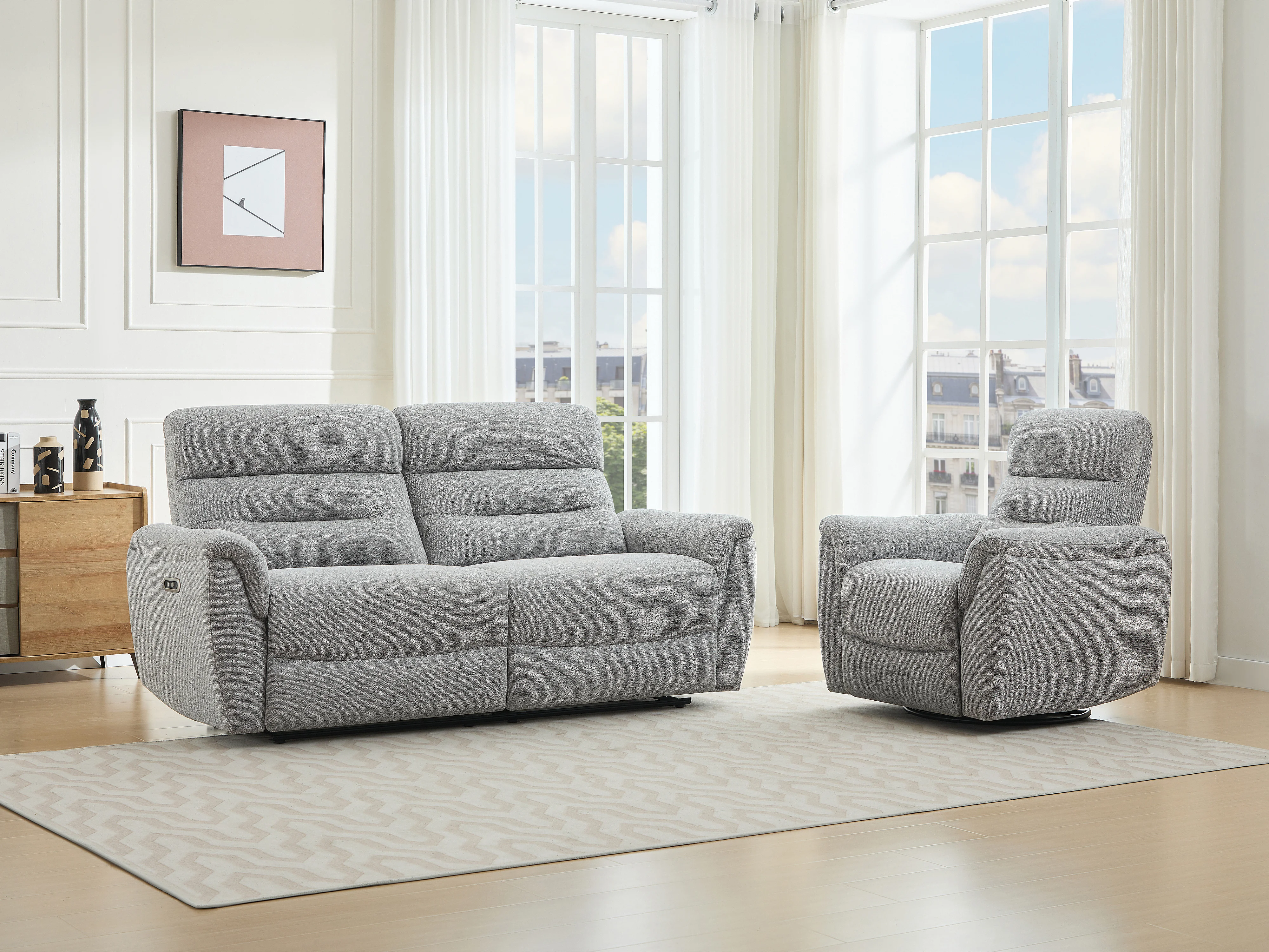 Driezitsbank en elektrische relaxfauteuil in grijs gestructureerde stof - BREVIO