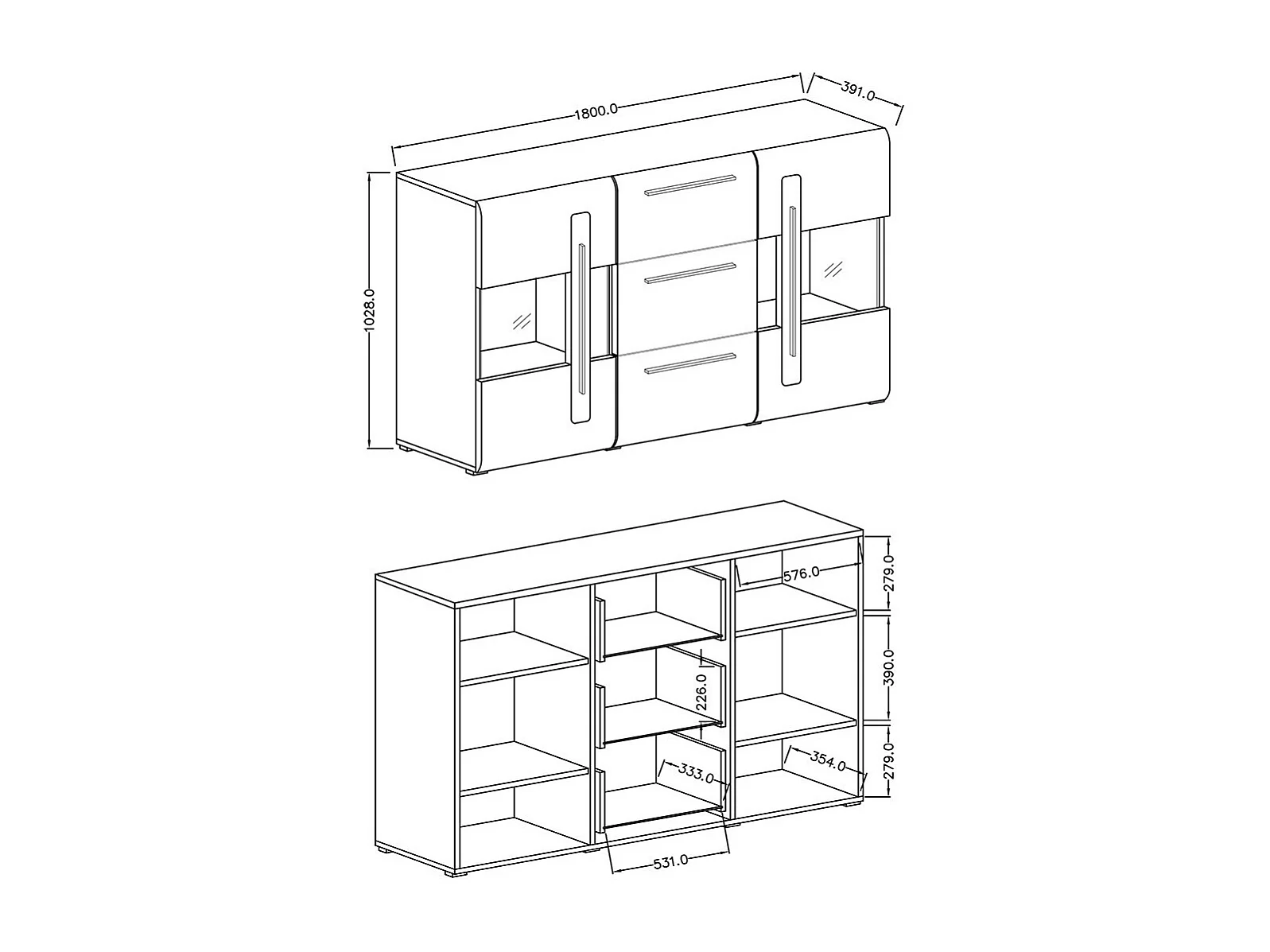 Buffet 180cm collectie BREDA met twee deels beglaasde deuren en drie laden. Kleur Eiken