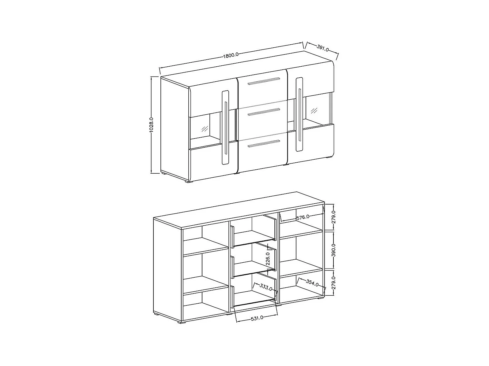 Buffet 180cm collectie BREDA met twee deels beglaasde deuren en drie laden. Kleur Eiken
