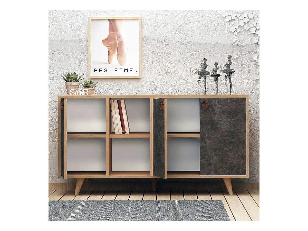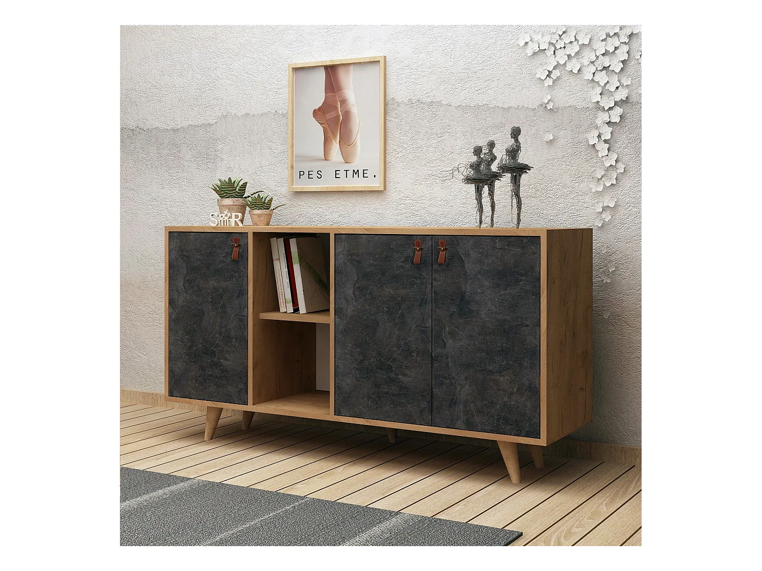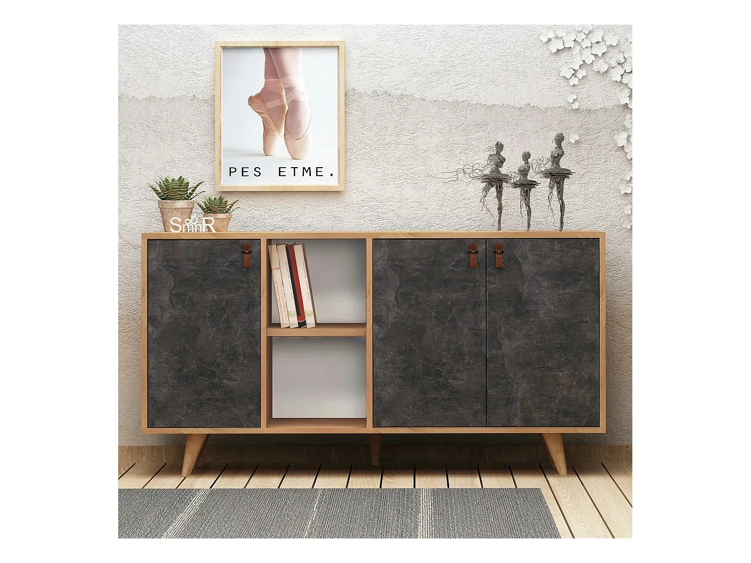 Buffet 3 deuren en 2 nissen in eiken en antracietgrijze steendecor L140 cm - Planky