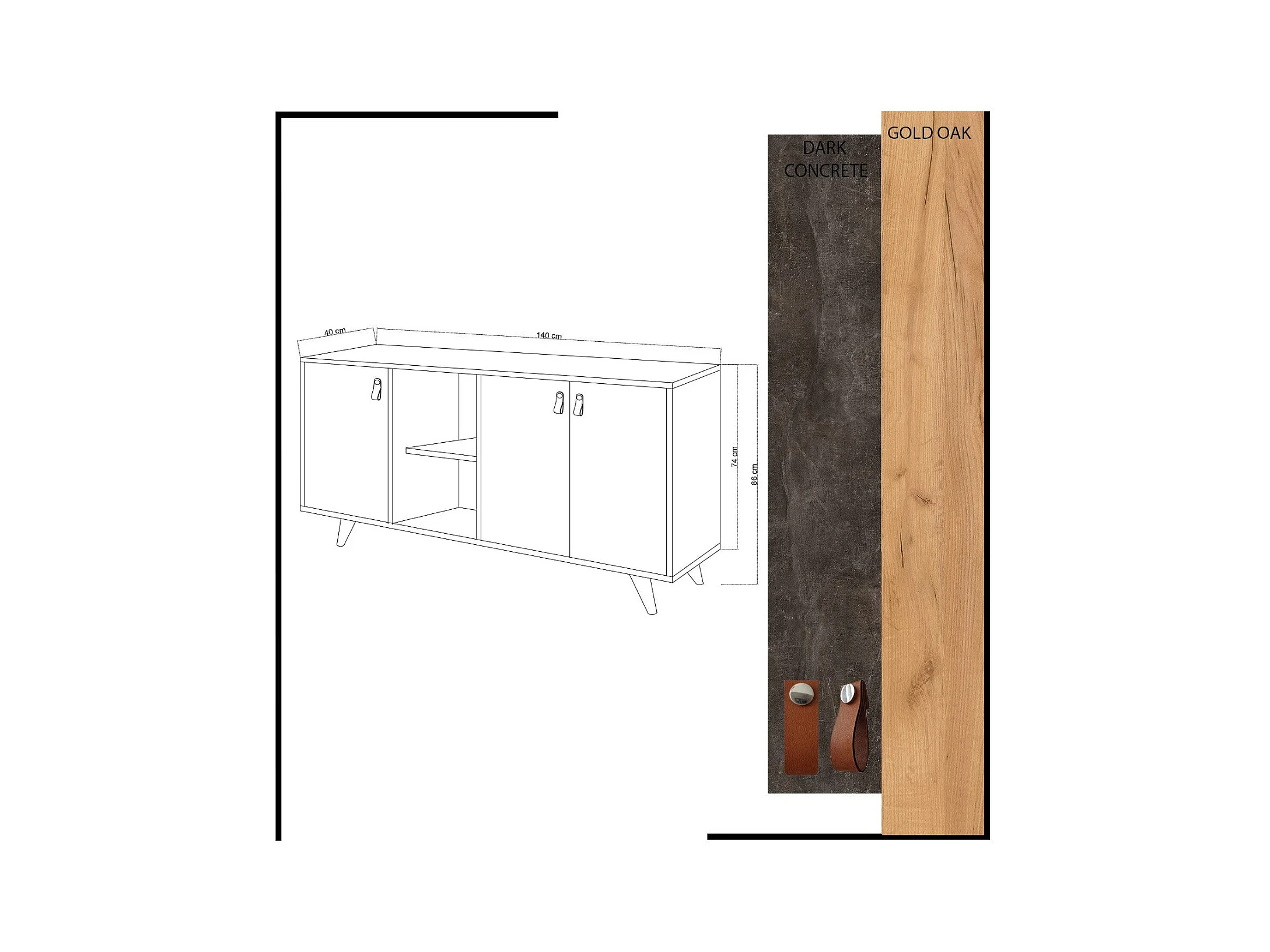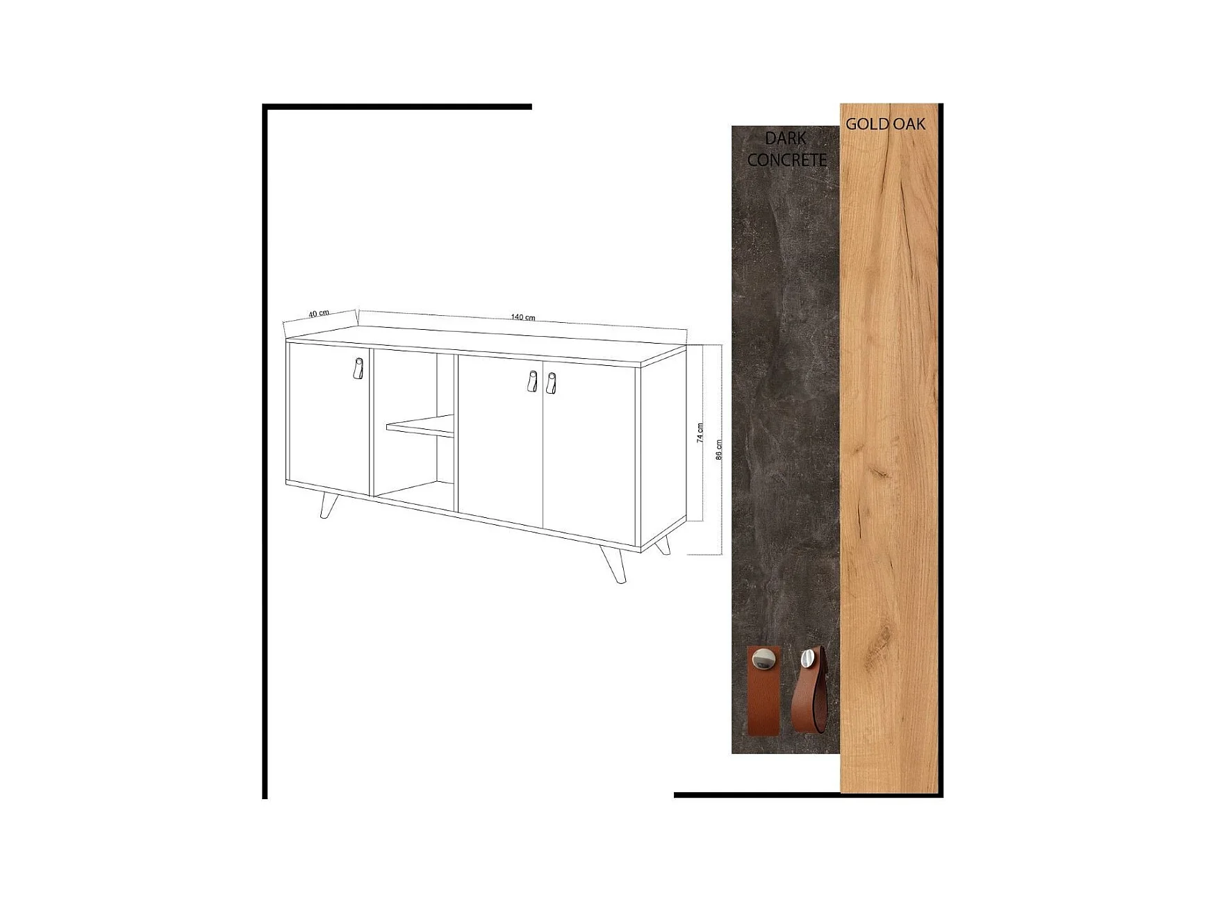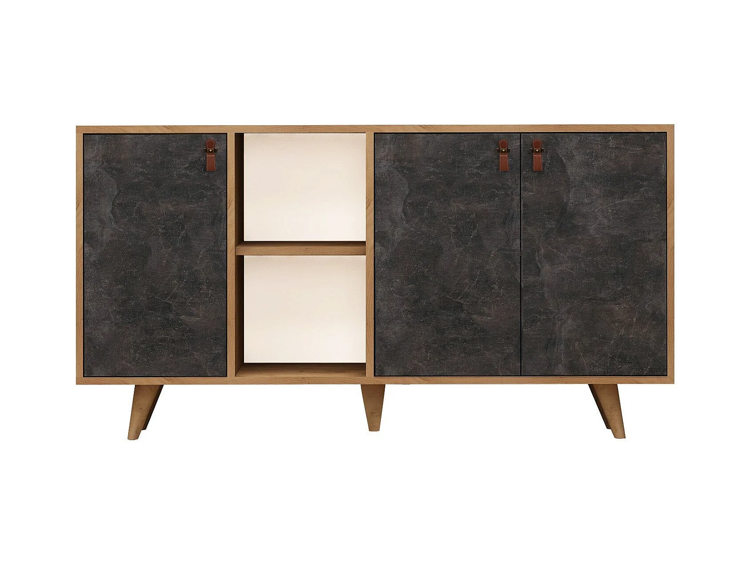 Buffet 3 deuren en 2 nissen in eiken en antracietgrijze steendecor L140 cm - Planky