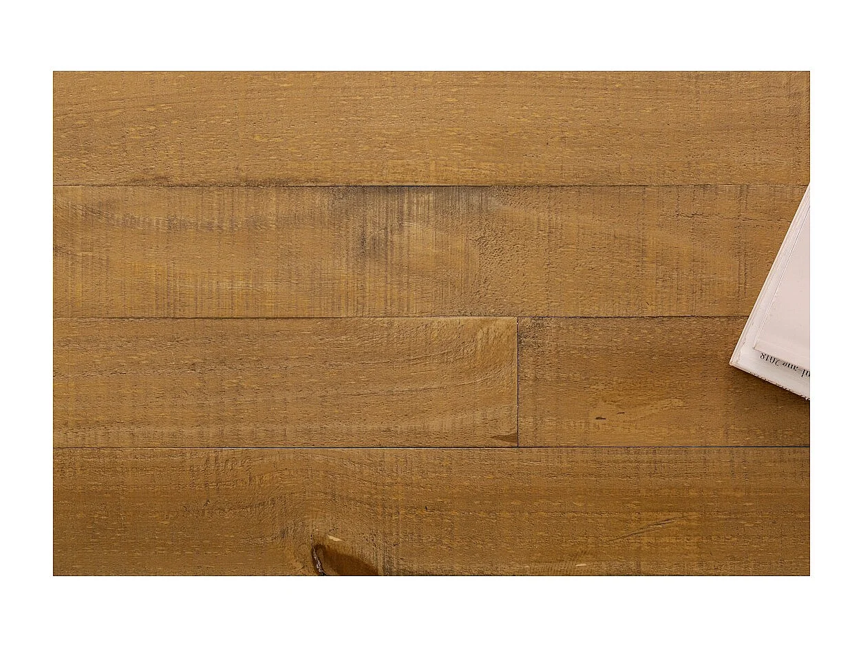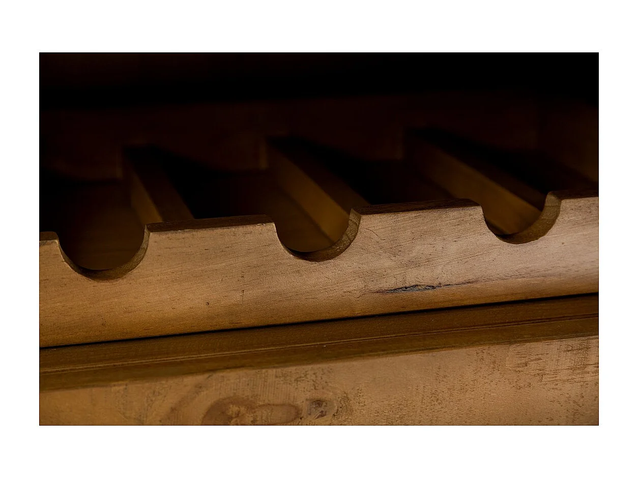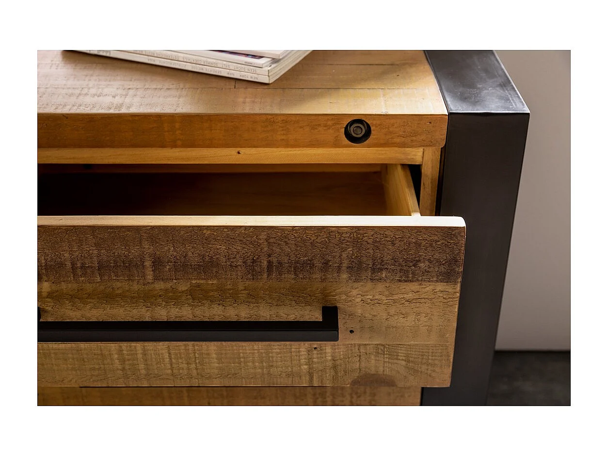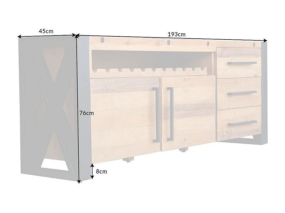 Buffet CAVARA 195 cm – Massief vintage bruin grenen en zwart metaal – 2 deuren, 3 laden en wijnrek
