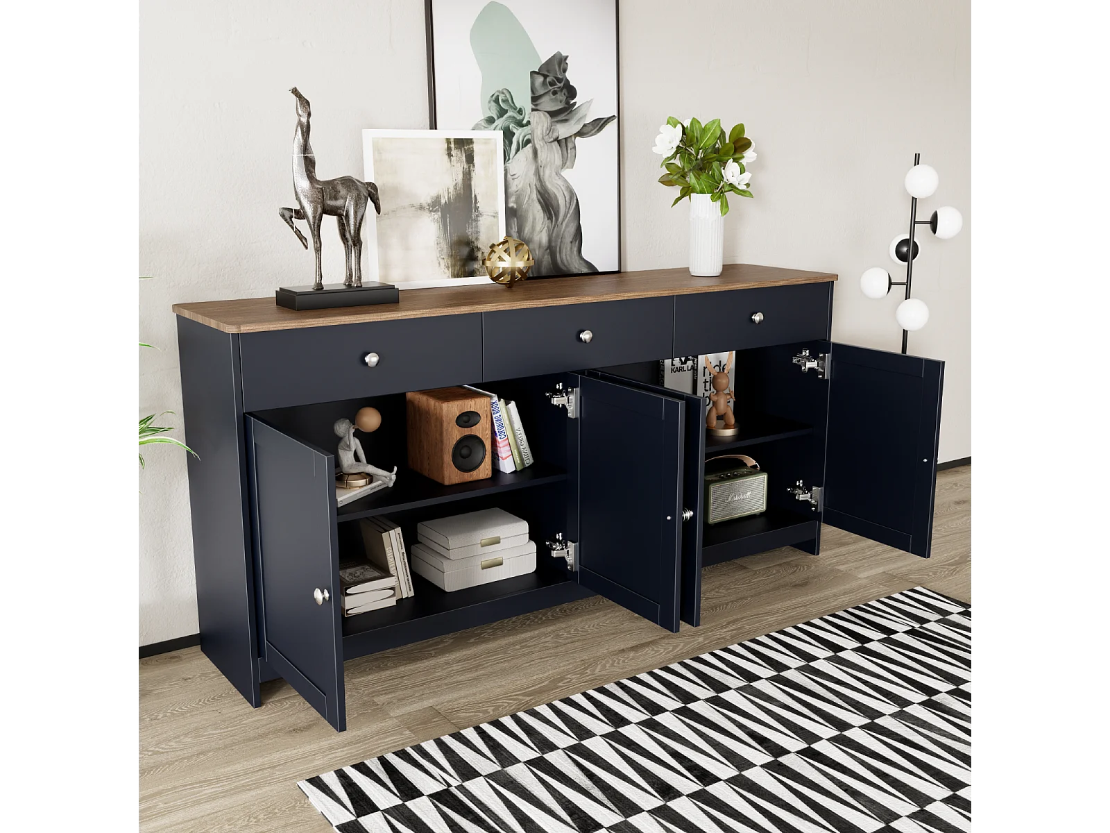 Dressoir van wit geaderd hout 160 L x 37 B x 75H - Dressoir met 4 deuren en 3 lades voor woonkamer, eetkamer - Donkergrijze kleur