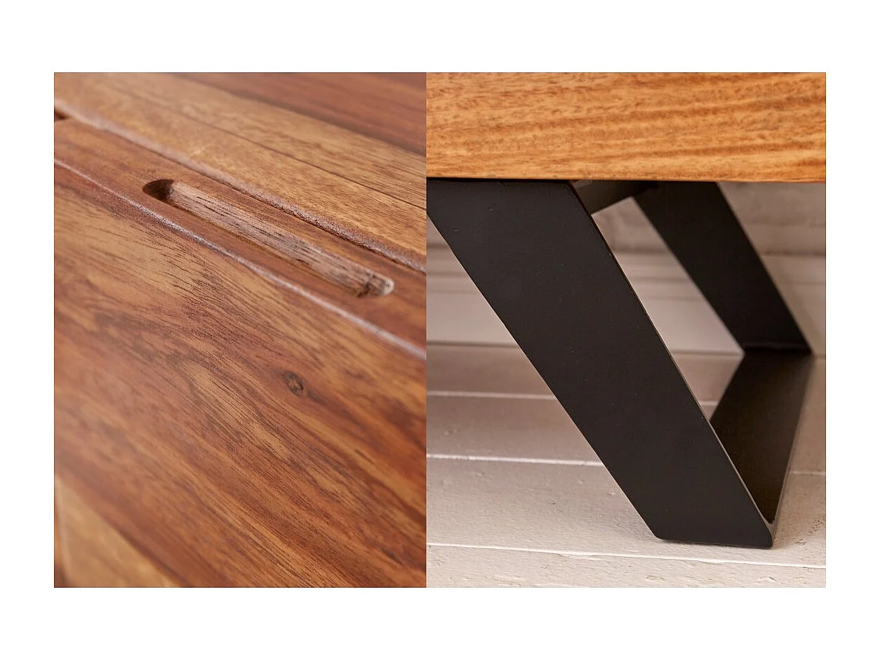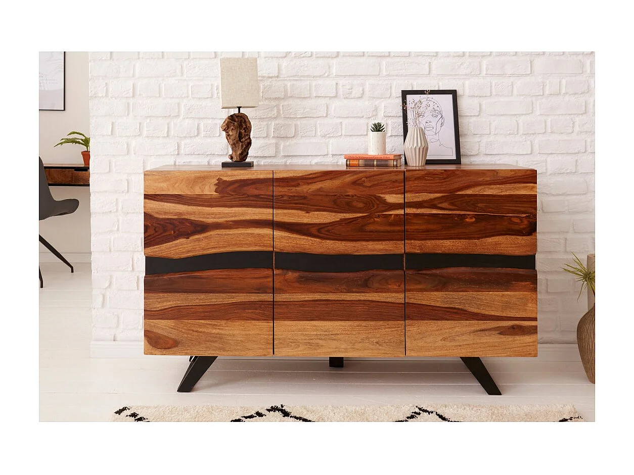 Buffet ORKAN 150 cm – Massief Sheeshamhout en zwart metaal – 3 deuren in industriële stijl