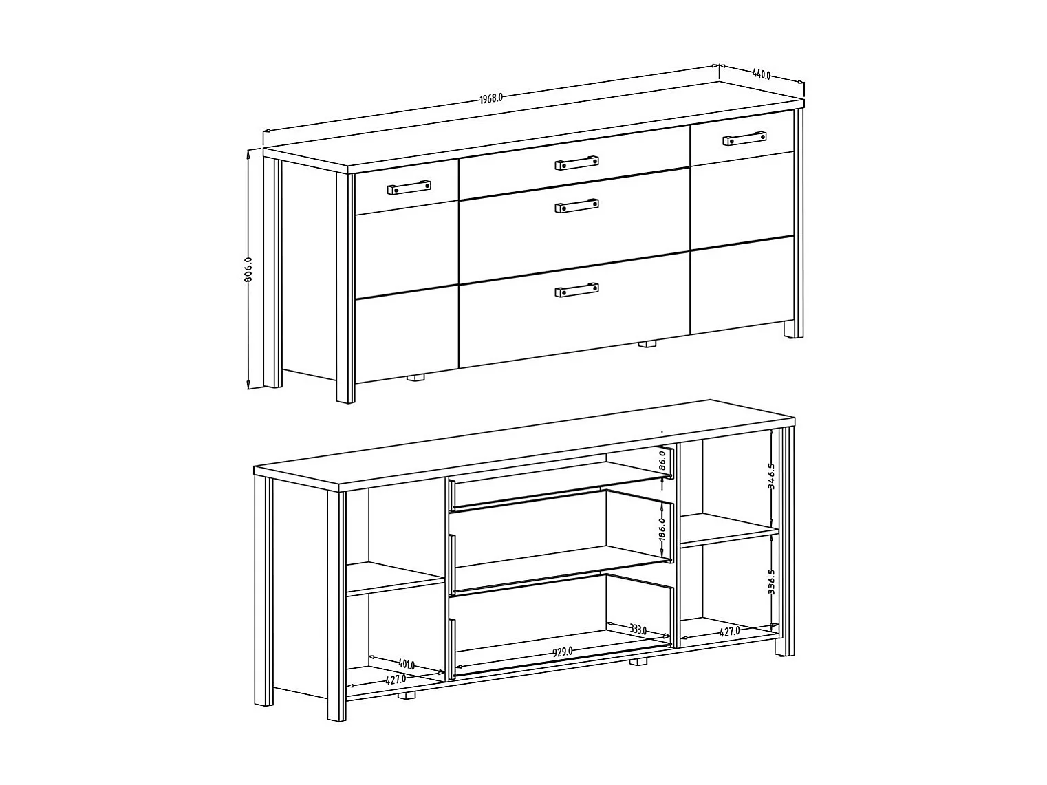 Buffet WINDSOR antracietgrijs en donkereiken - 3 laden en 2 deuren - 196,8 x 80,6 x 44 cm