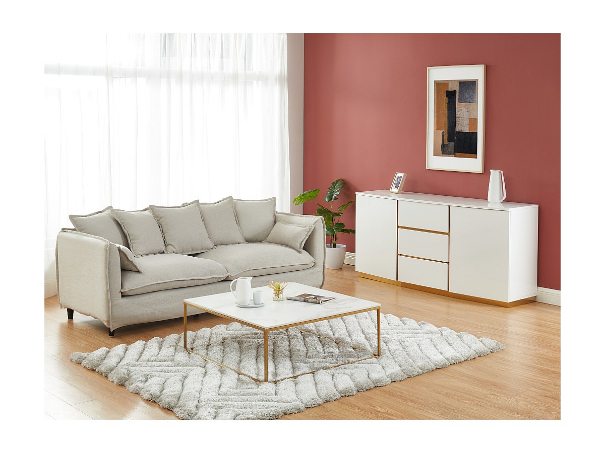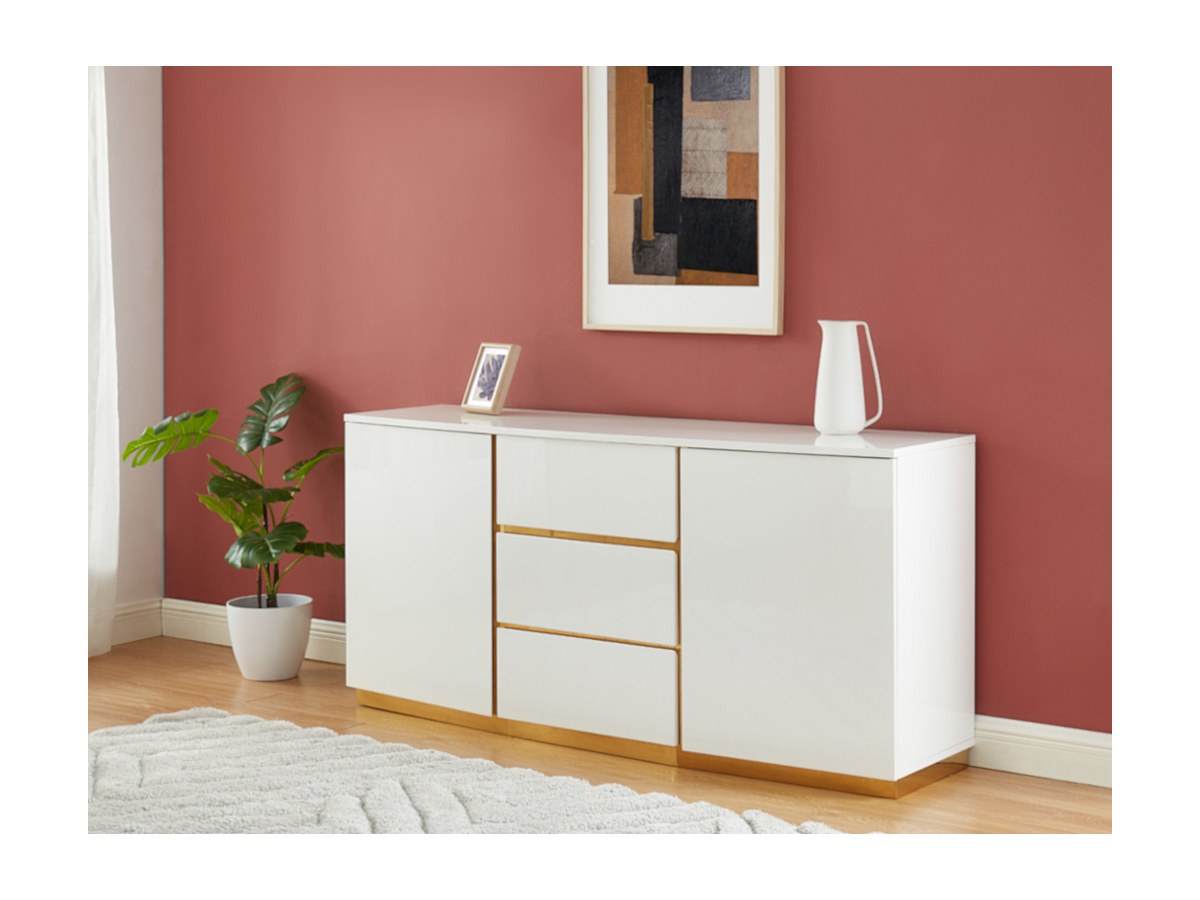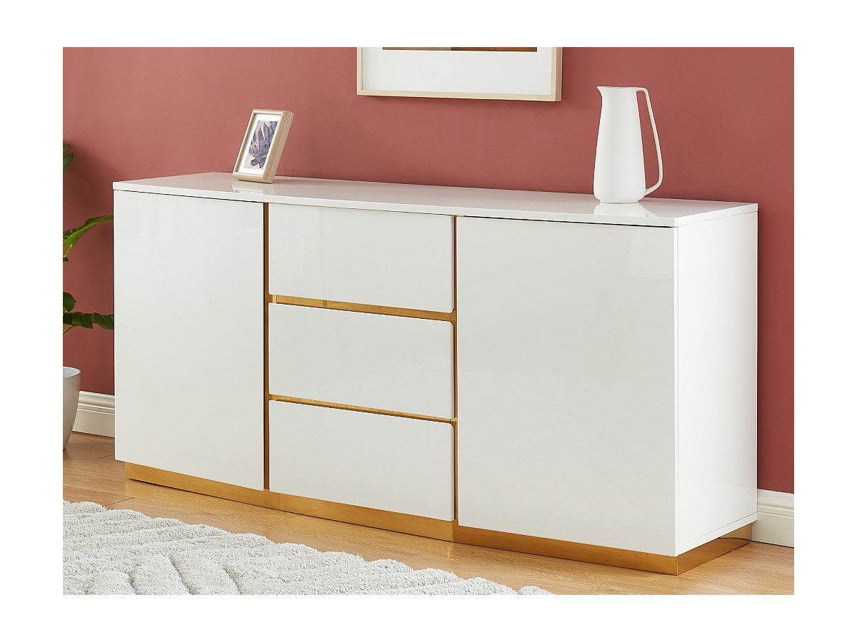 Met zijn moderne en lichte tinten vindt de buffetkast FERIHANE een plek in elk soort interieur en brengt er een verfijnde sfeer in. Om de charme van deze buffetkast goed tot zijn recht te laten komen, plaatst u hem het best voor een gekleurde muur, waardoor het gelakte wit en het goud mooi uitkomen.