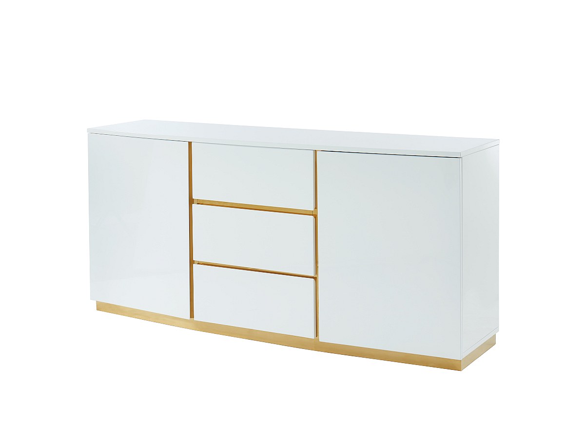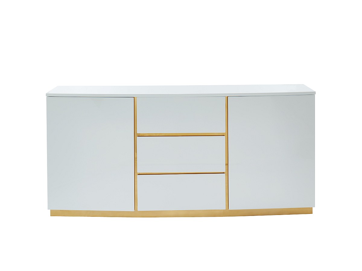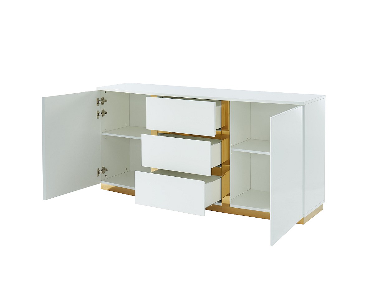 Het goud van het staal contrasteert met het wit, en de chique uitstraling ervan springt daardoor meteen in het oog. Die gouden kleur geeft de buffetkast een subtiele en trendy afwerking.