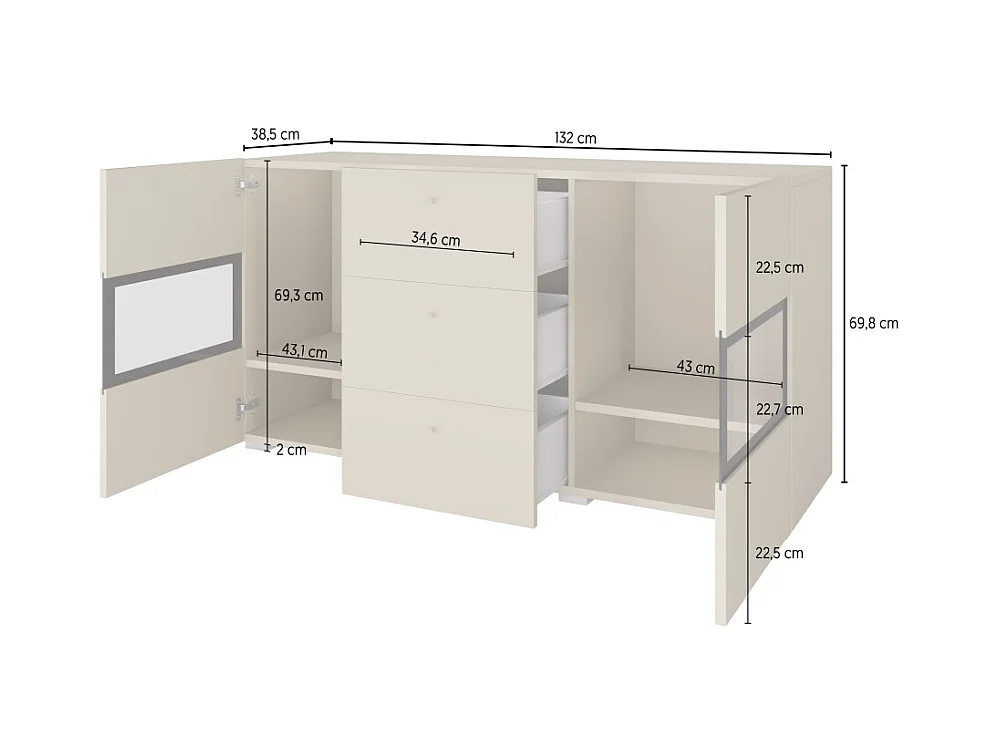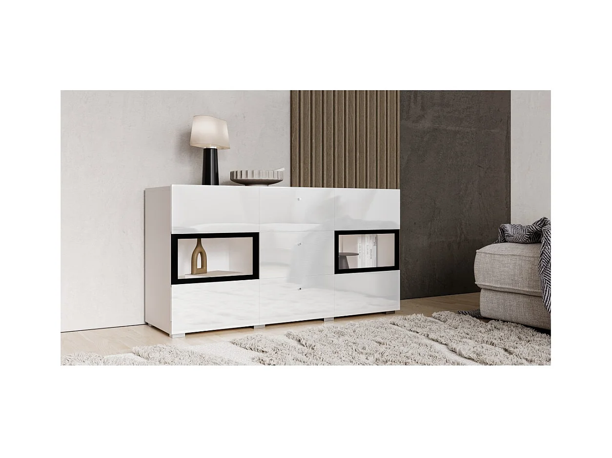 Buffetkast met 2 deuren en 3 laden uit de collectie RAMOS. Kleur glanzend wit en zwart.