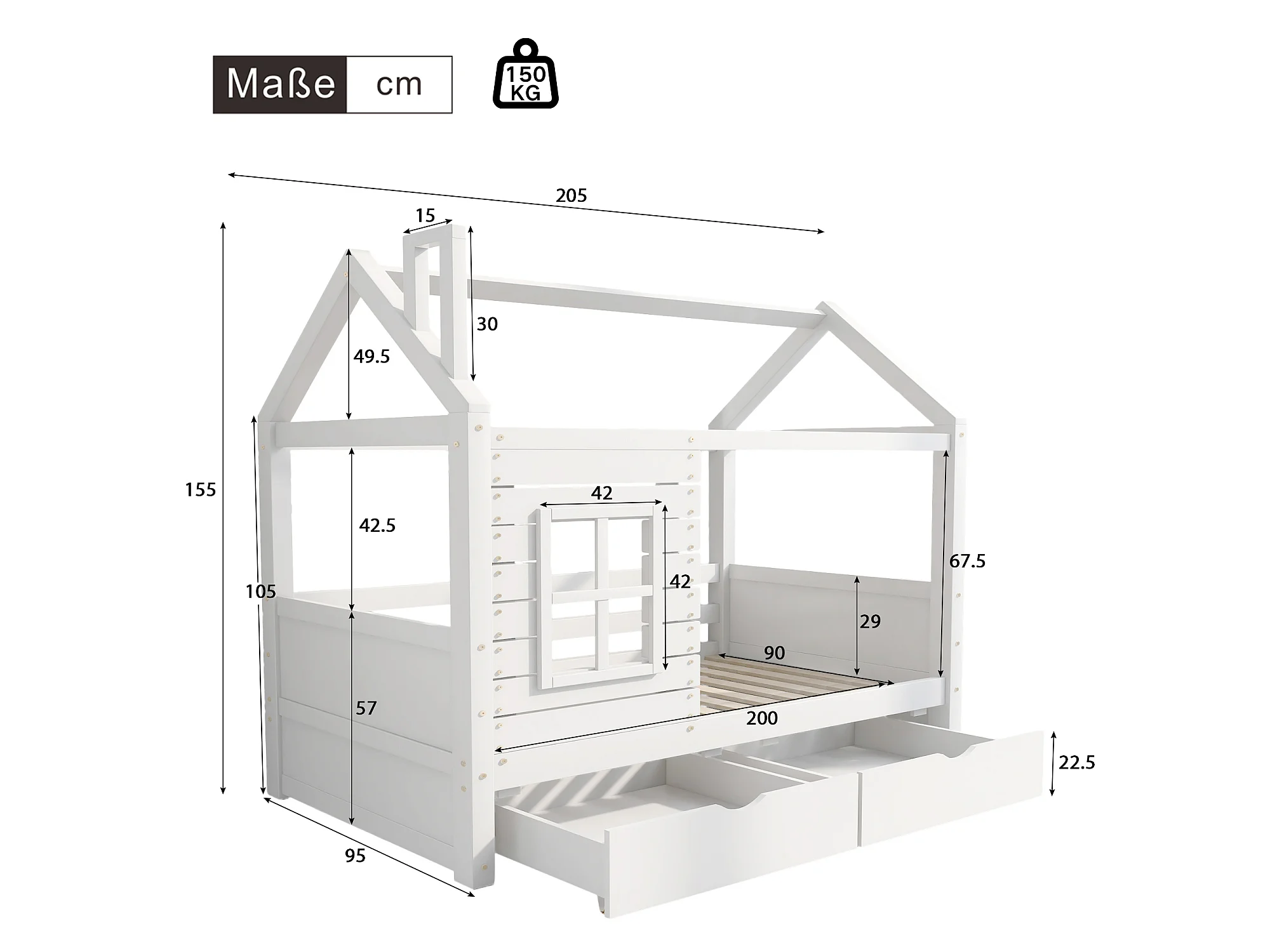 Kajuitbed 90x200 cm met 2 lades - huisvormig - massief hout - Wit