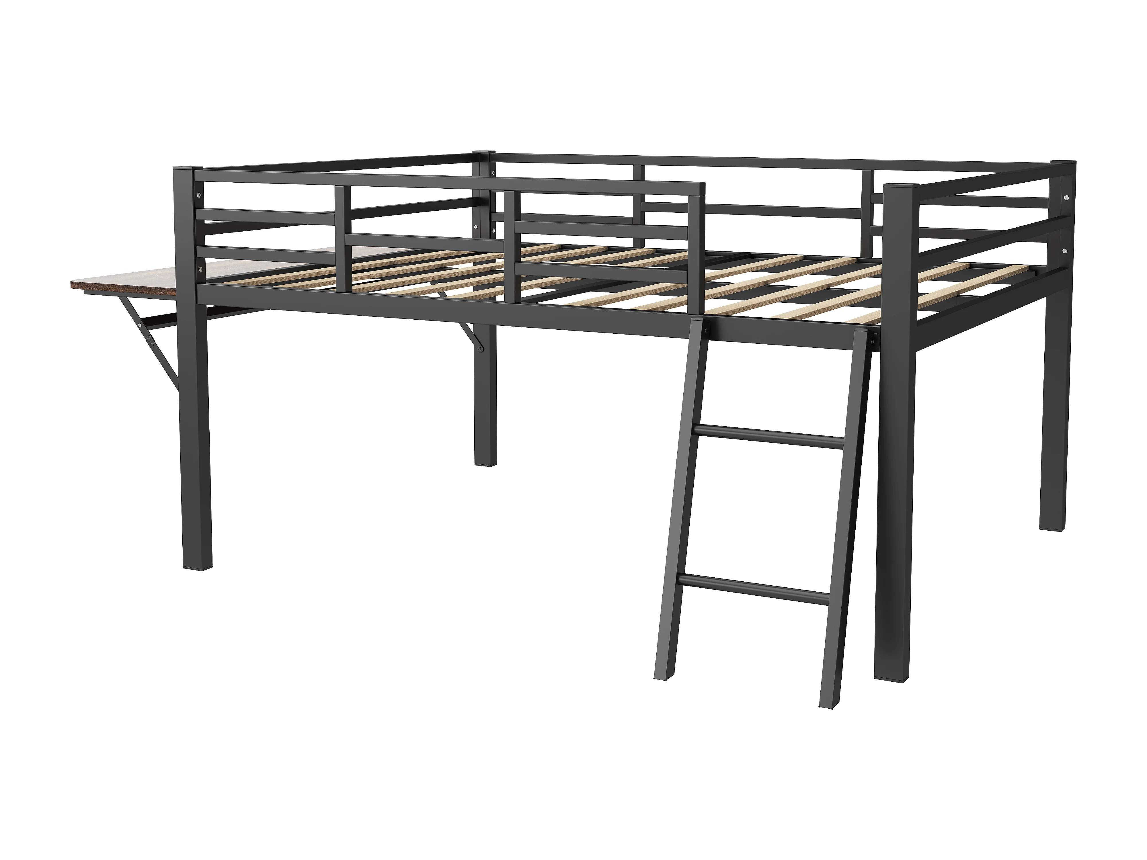 Cama plana de 140x200 cm en metal negro con barandillas, escalera, escritorio y tira LED con control remoto – cama moderna sin colchón