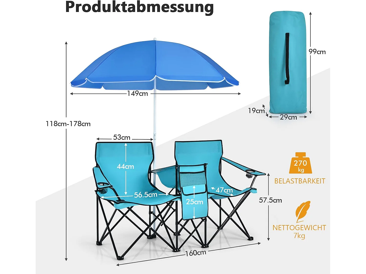 Campingstoel met parasol klapstoel voor koppels dubbele visstoel opvouwbaar met bekerhouder koeltas (Turkoois groen) 55 x 85 x 161 cm