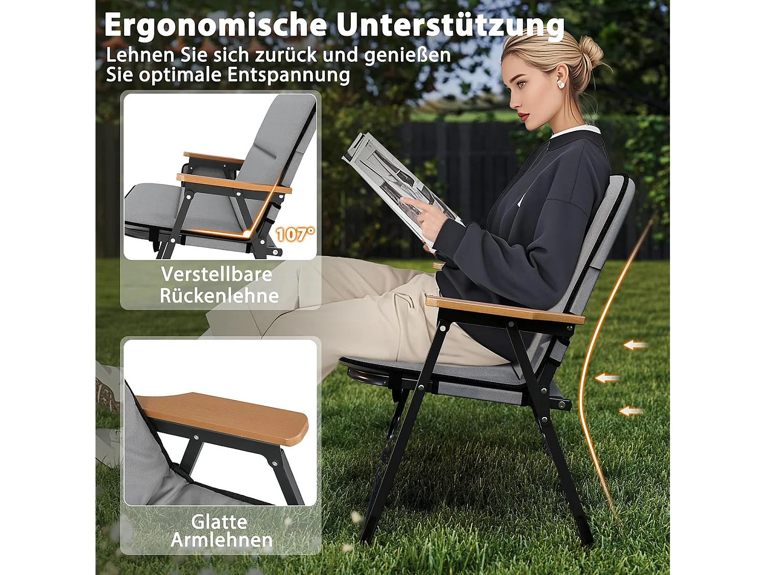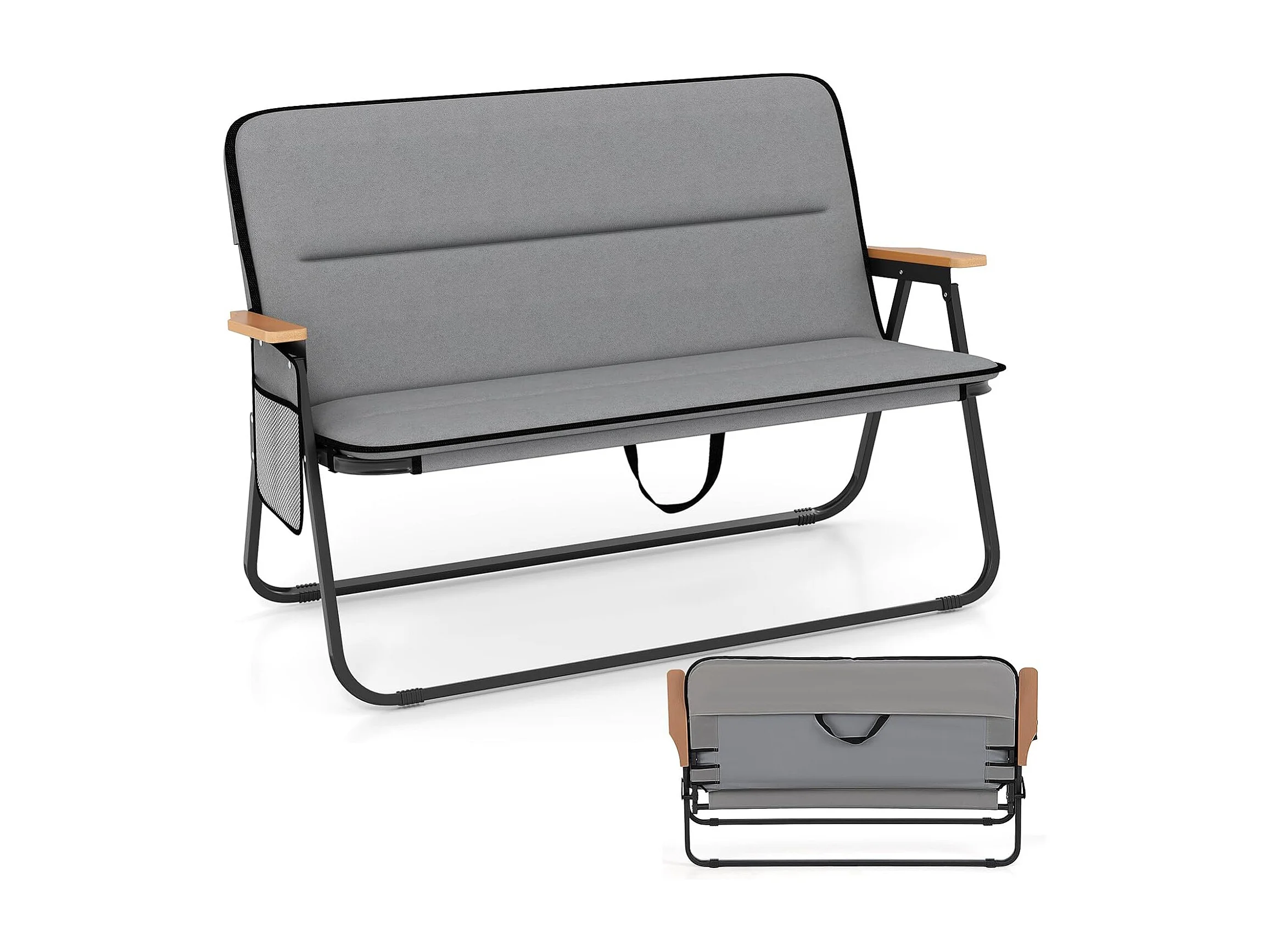 Campingstoel voor 2 personen, klapstoel met afneembaar kussen, zijzak en armleuningen, 300 kg draagvermogen,vouwbank voor buiten, tuin, camping, grijsZB33127
