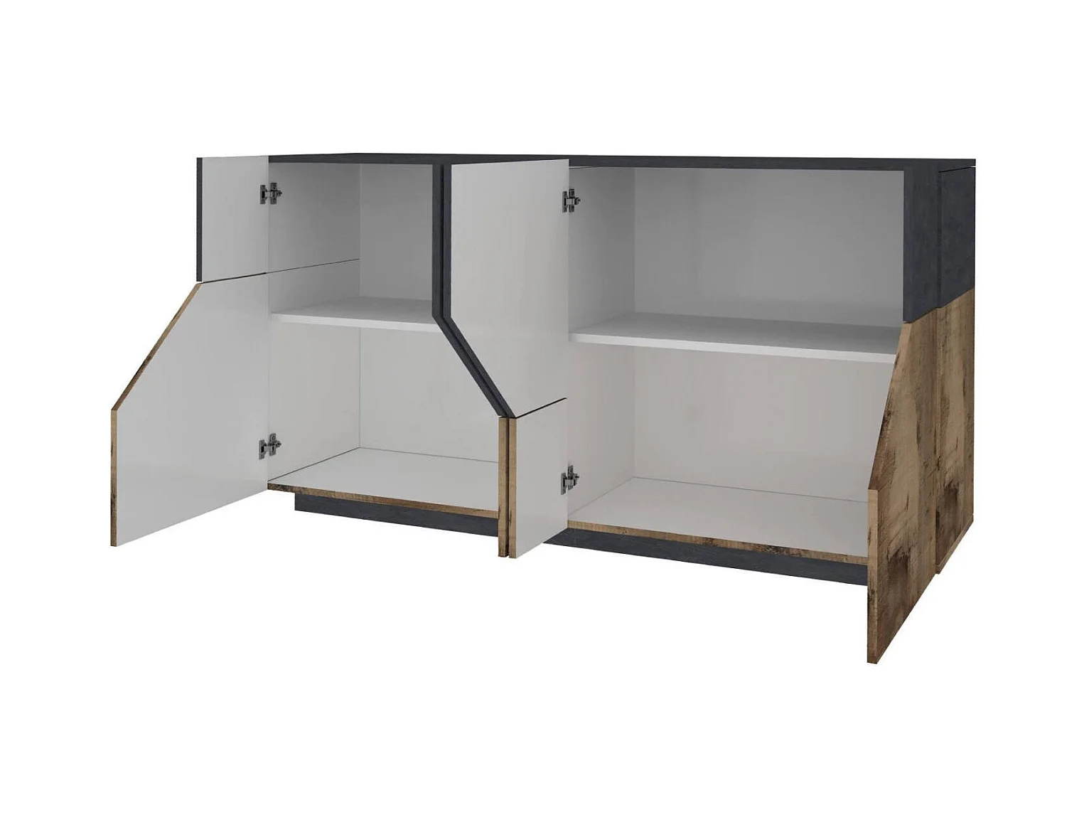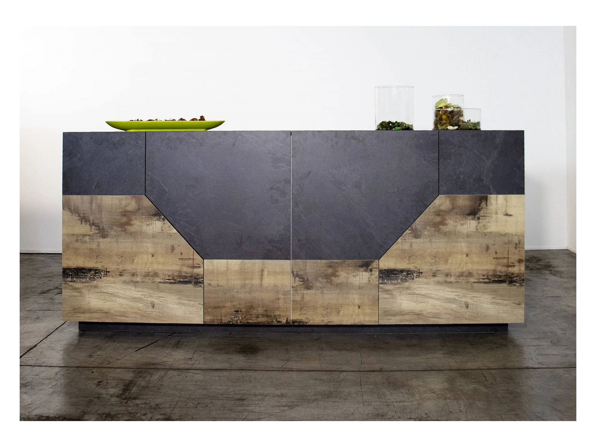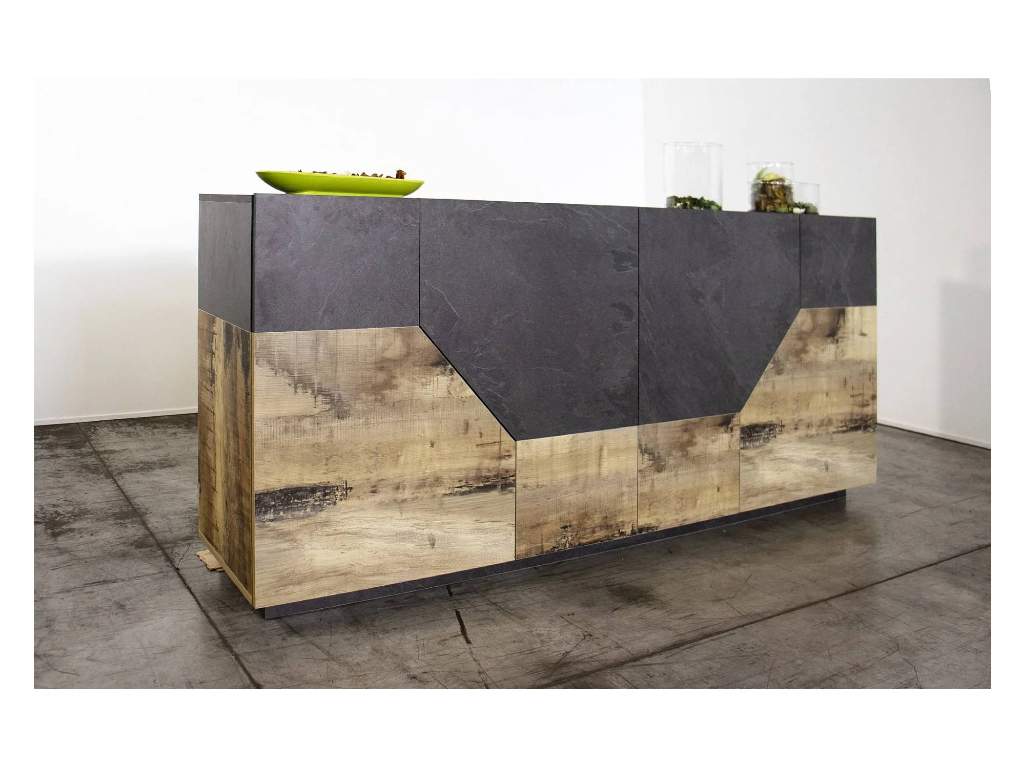 Carlo dressoir, Keukendressoir met 4 geometrische deuren, Woonkamerbuffet, Keukendressoir, 100% Made in Italy, 159x43h86 cm, Leisteen en esdoorn