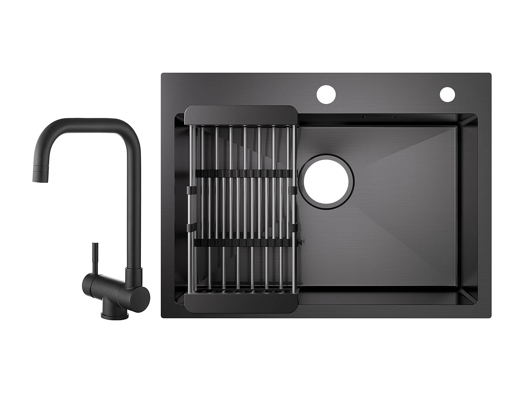 kom keukenspoelbak 60×45×18CM zwarte roestvrijstalen spoelbak met afvoermand + zwarte roestvrijstalen keukenmengkraan