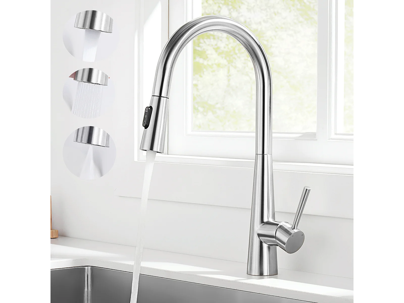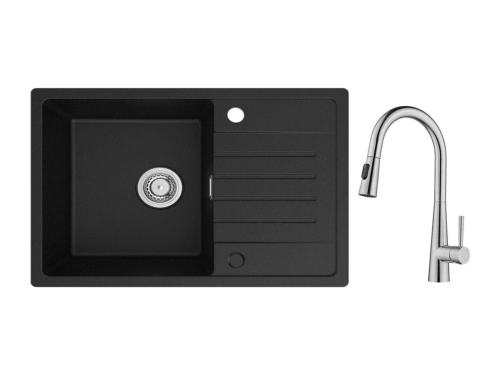 Cecipa max 1 spoelbak met afdruiprek, 78x45cm Spoelbak in kwarts en zwarte hars + Mengkraan met uittrekbare spray, 3 wateruitlaatmodi, Geborsteld