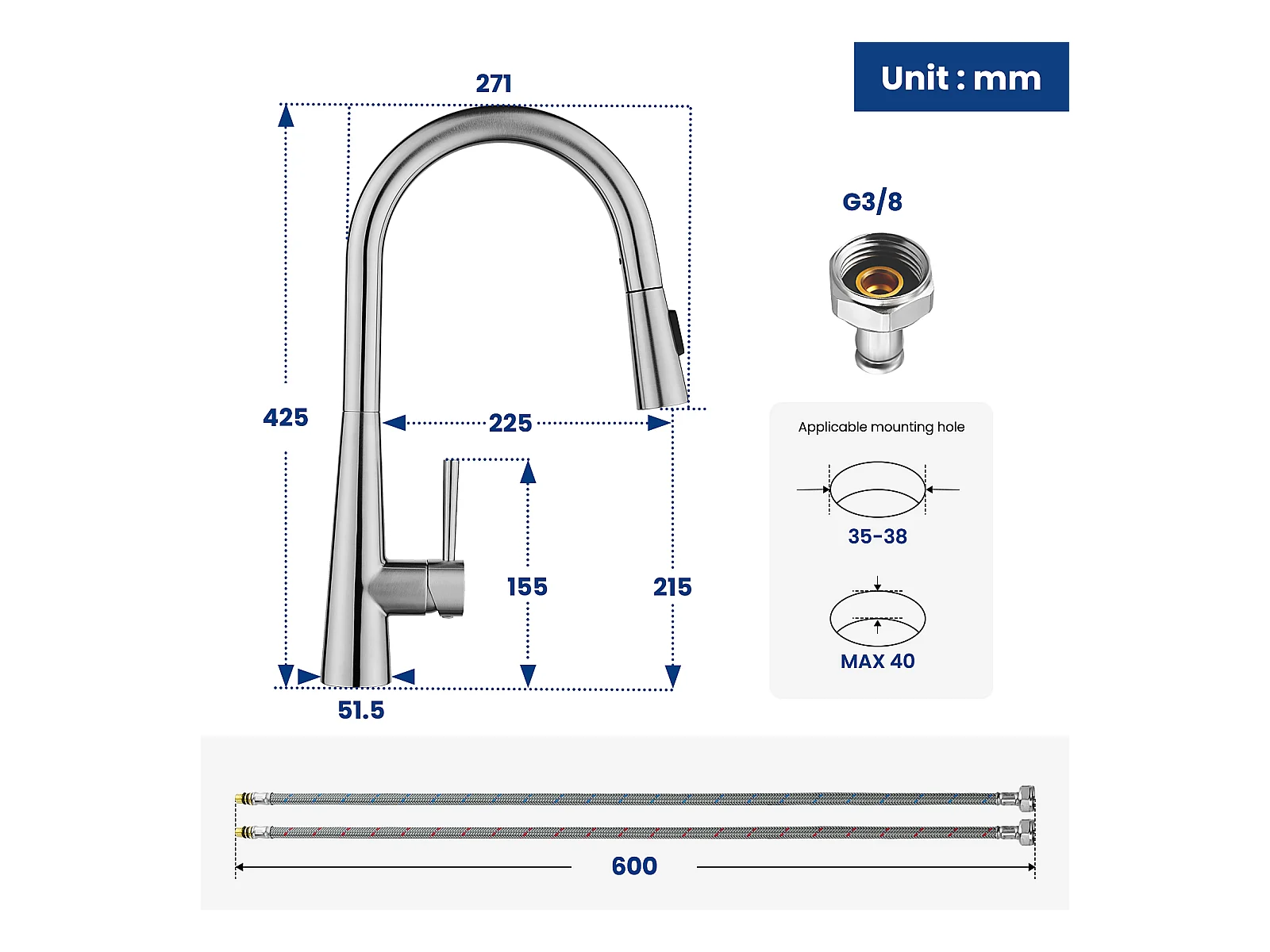 Aanrecht met 1 kom, 70×44×21CM, geborstelde roestvrijstalen spoelbak met afdruiprek en wastafel + keukenmixer met uittrekbare spray