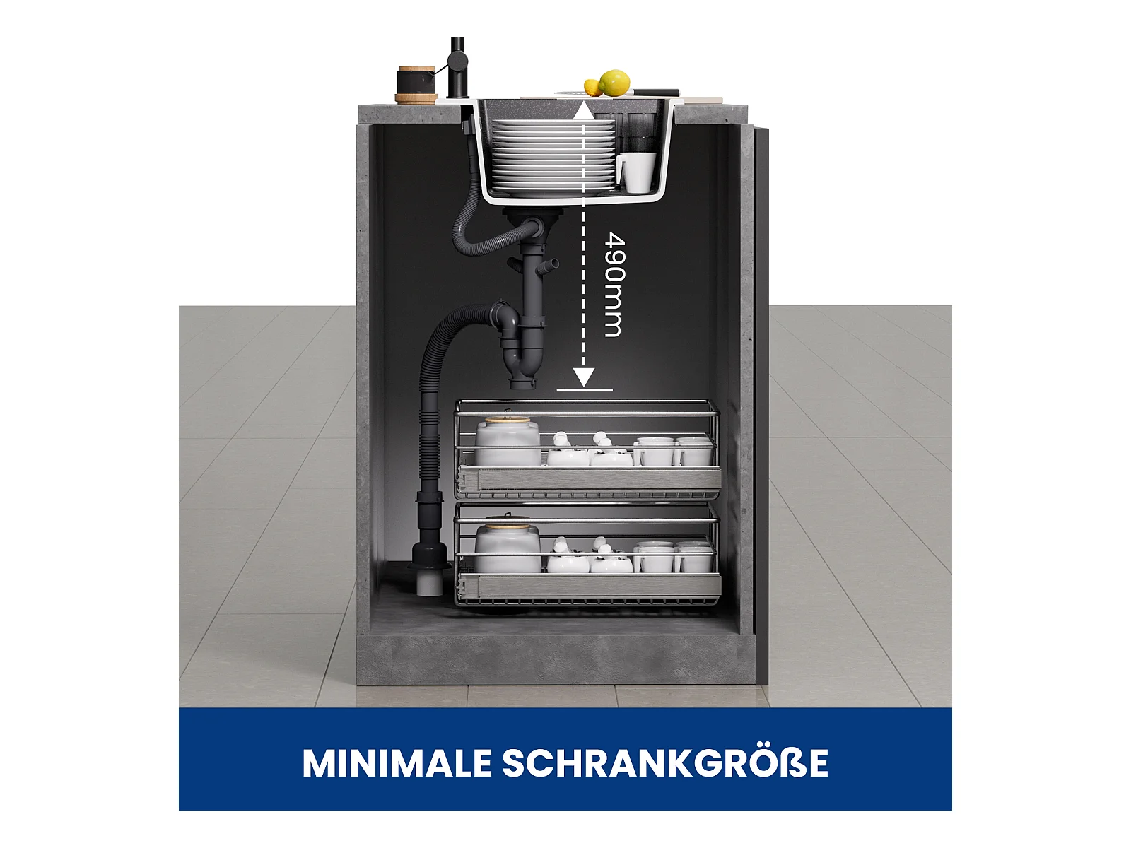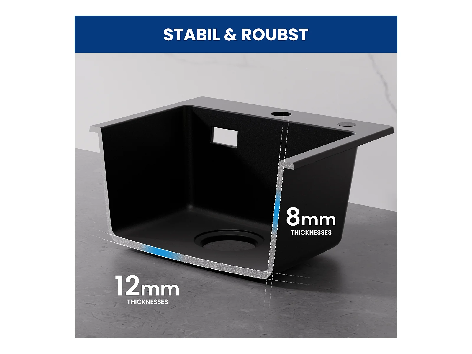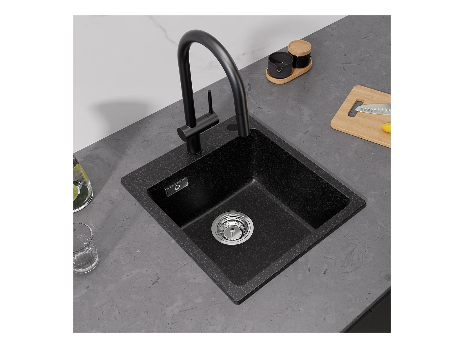 Cecipa max 40x45cm keukenspoelbak in kwarts en hars 1 bak onderbouwspoelbak 1 bak spoelbak zonder zeepdispenser zwart, EU-model