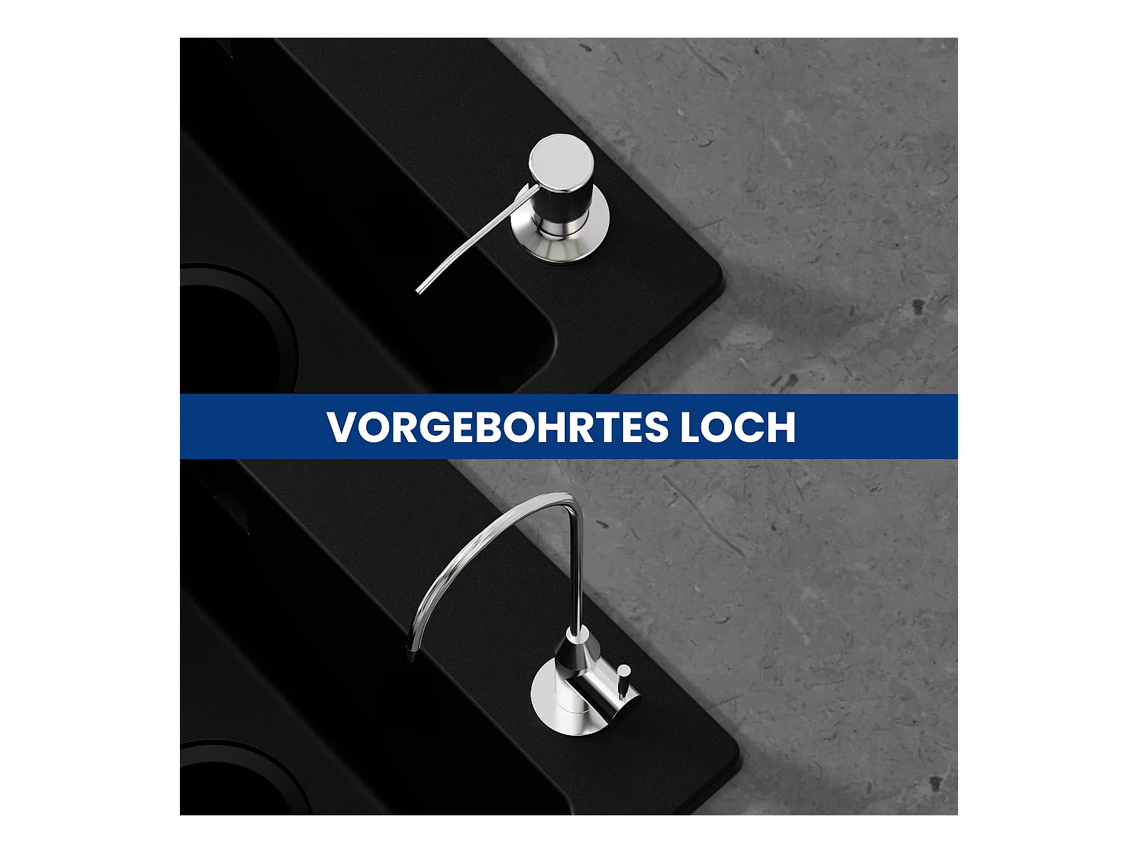 Cecipa MAX 40x45cm zwarte keukenspoelbak in kwarts en hars 1 spoelbak + 3-weg spoelbakmengkraan, 2 hendels, zwart