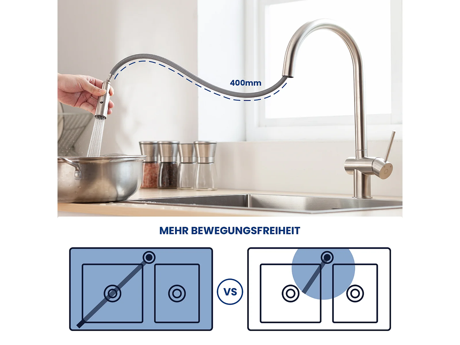 Cecipa max 40x45cm keukenspoelbak in kwarts en hars quartz spoelbak 1 kom zwart + keukenmengkraan met geborstelde uittrekbare spray