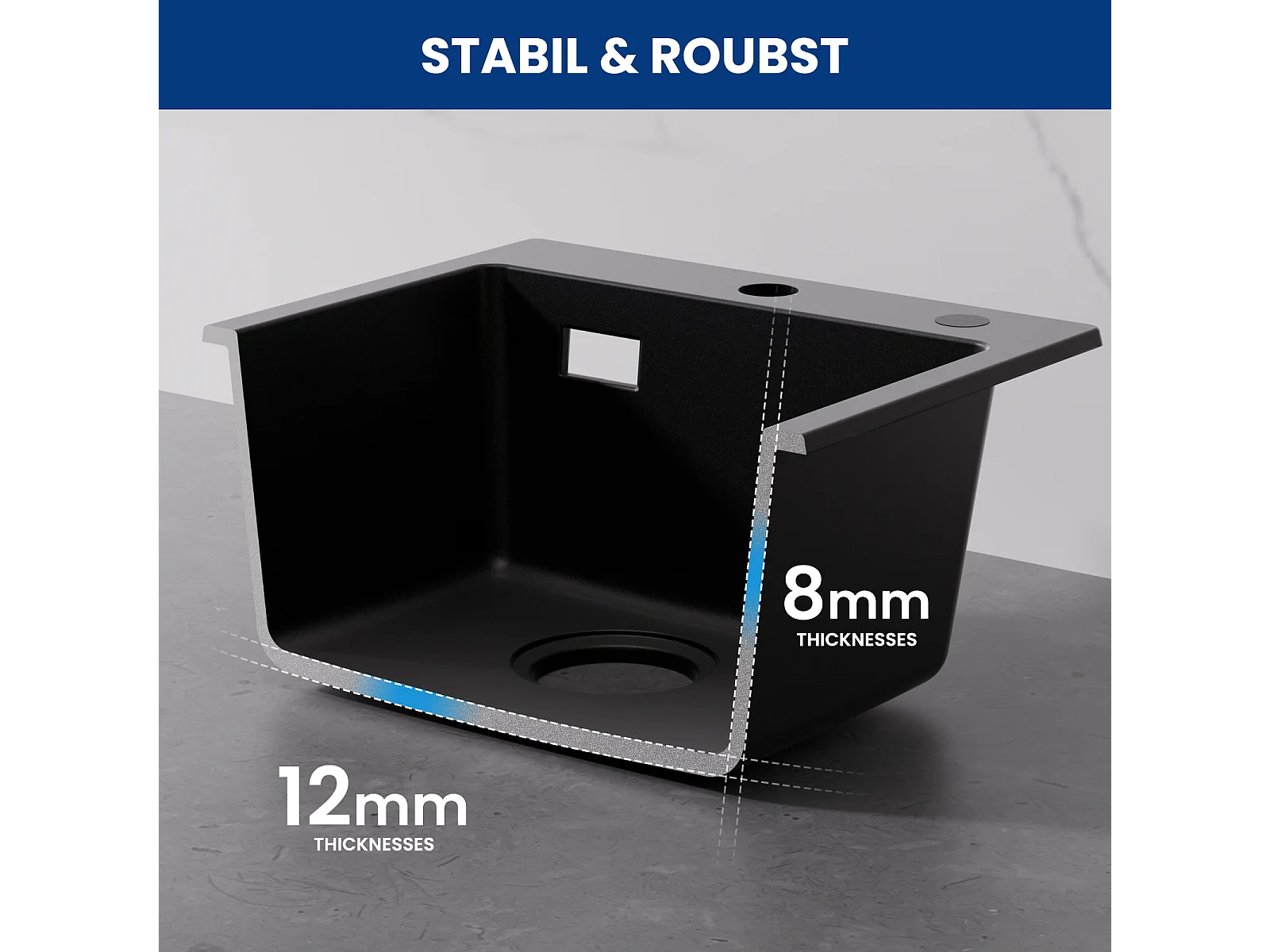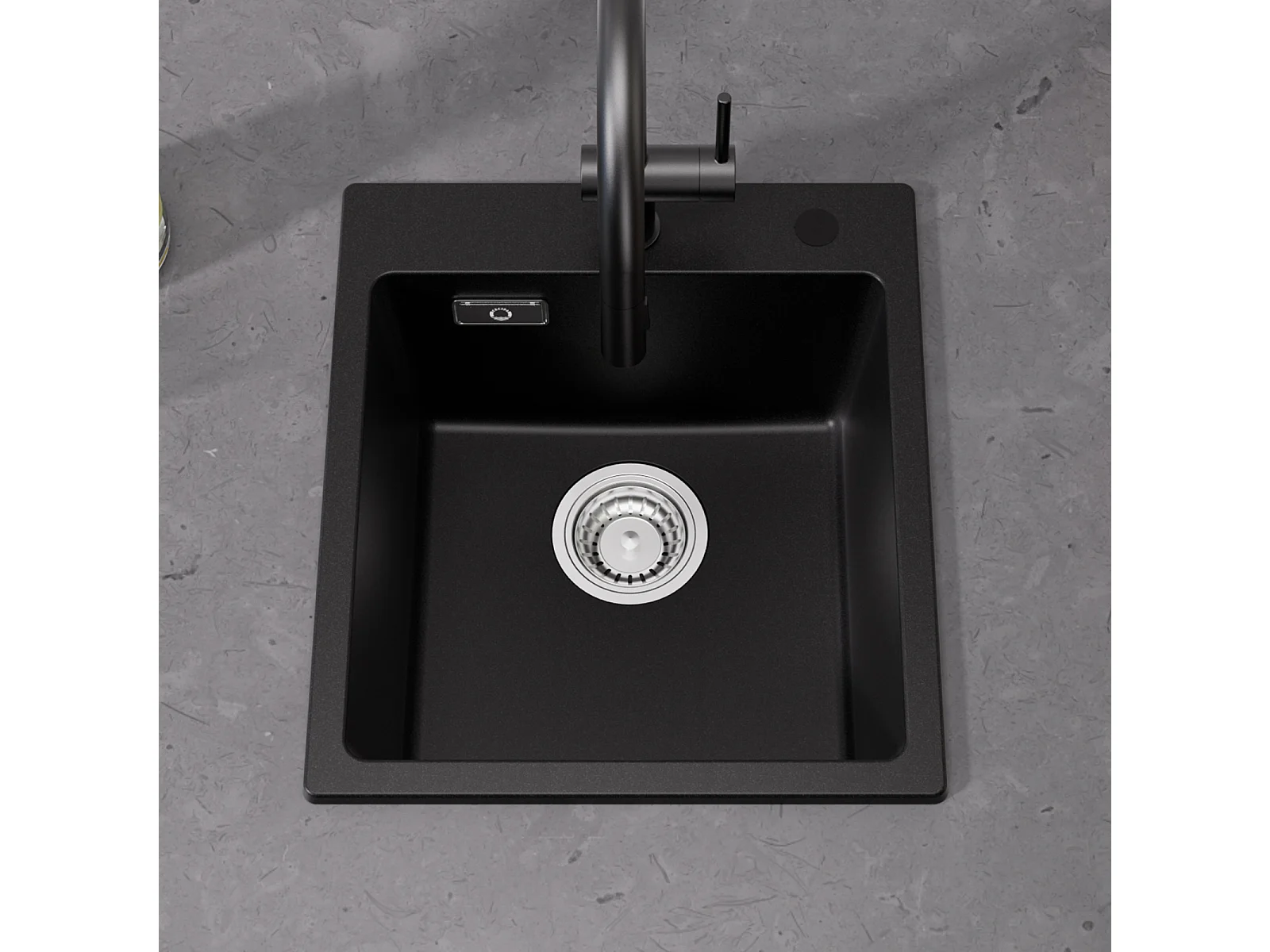 Cecipa MAX 40x45cm zwarte keukenspoelbak in kwarts en hars, 1 spoelbak + keukenmengkraan voor osmosesysteem